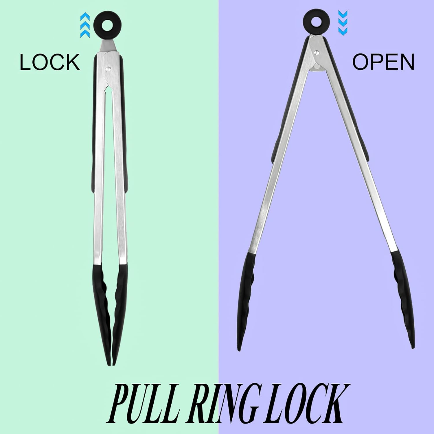 - EQUIPPED WITH A PULL-RING TECHNOLOGY: Our kitchen tongs are designed with a locking mechanism. The pull ring technology will keep your tongs from opening and closing. Simply pull the ring to lock and push to unlock.