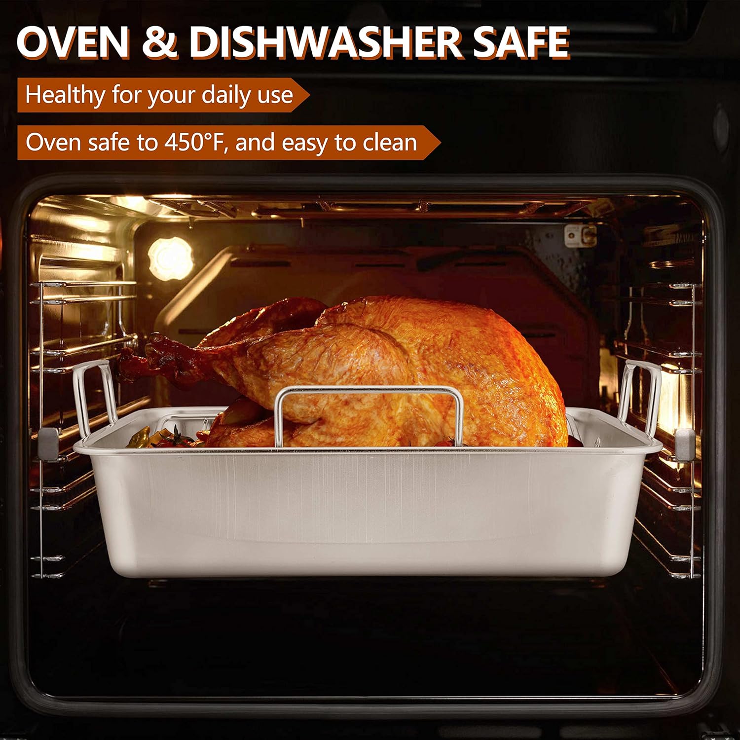 - Heavy Duty, turkey roasting pan is crafted with heavy gauge stainless steel without any toxic coatings, no deformation or twisting at high temperatures in oven safe to 450Β°F, rust resistance and healthy for long lasting durability, great alternative to aluminum pan and racks