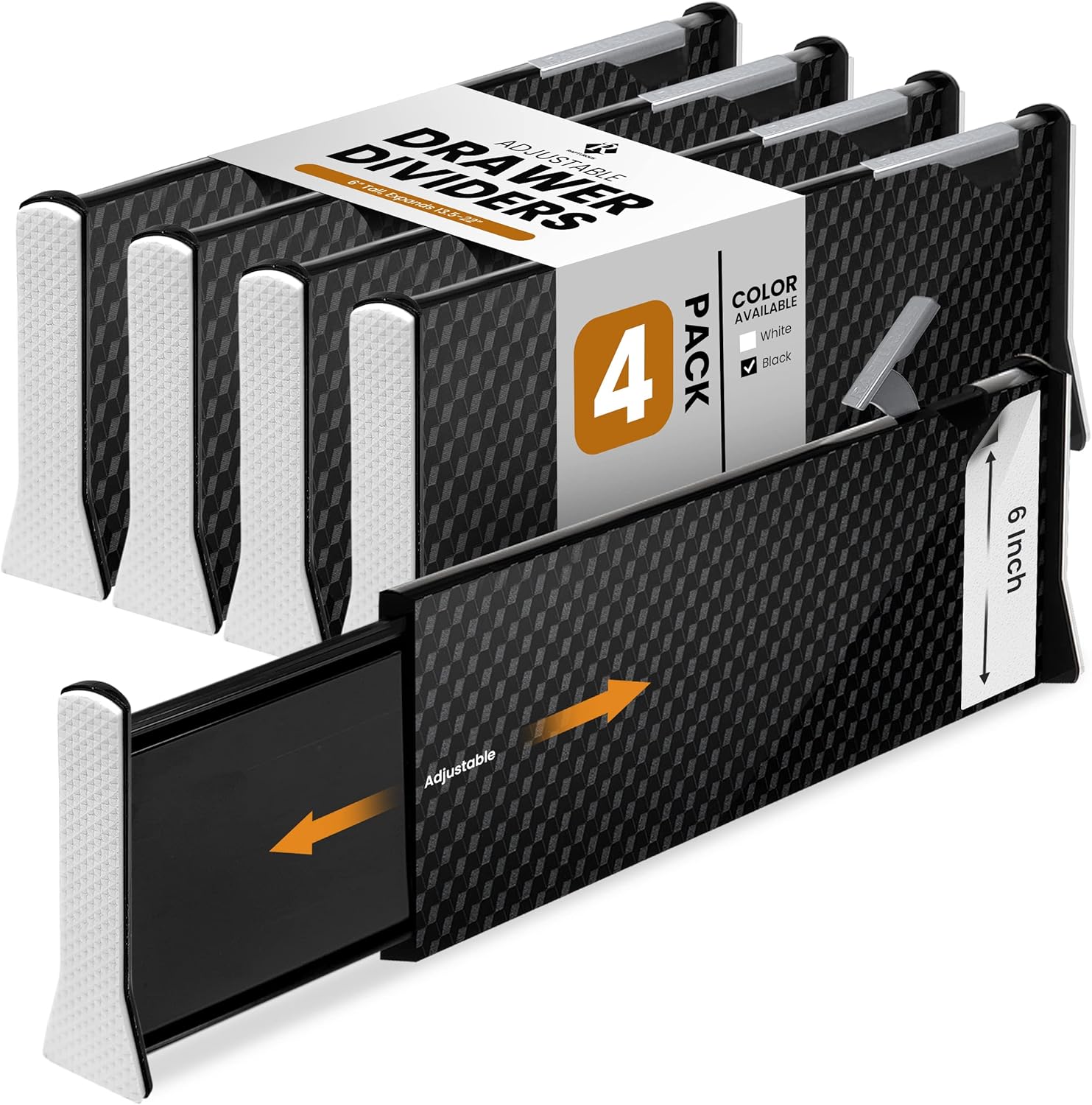 RAPTUROUS Adjustable Drawer Dividers, 6" Tall, Expandable 13-22", 4-Pack, Non-Slip for Deep Drawers in Kitchen, Bedroom, Office, and Nursery (Black)