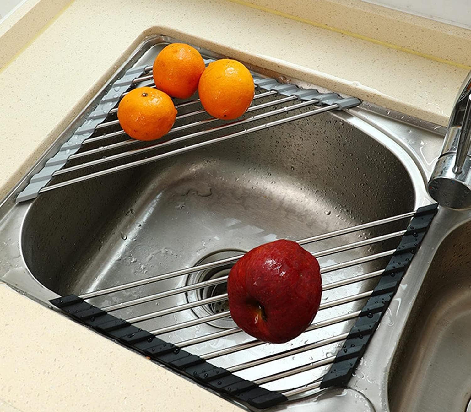 - Multi-use Folding Dish Drying Rack: This roll up drying rack unrolls above an open sink for air-drying washed dishes, for additional counter top space, or as a trivet. Vegetable and fruit dish drainers, great kitchen dish racks for counter