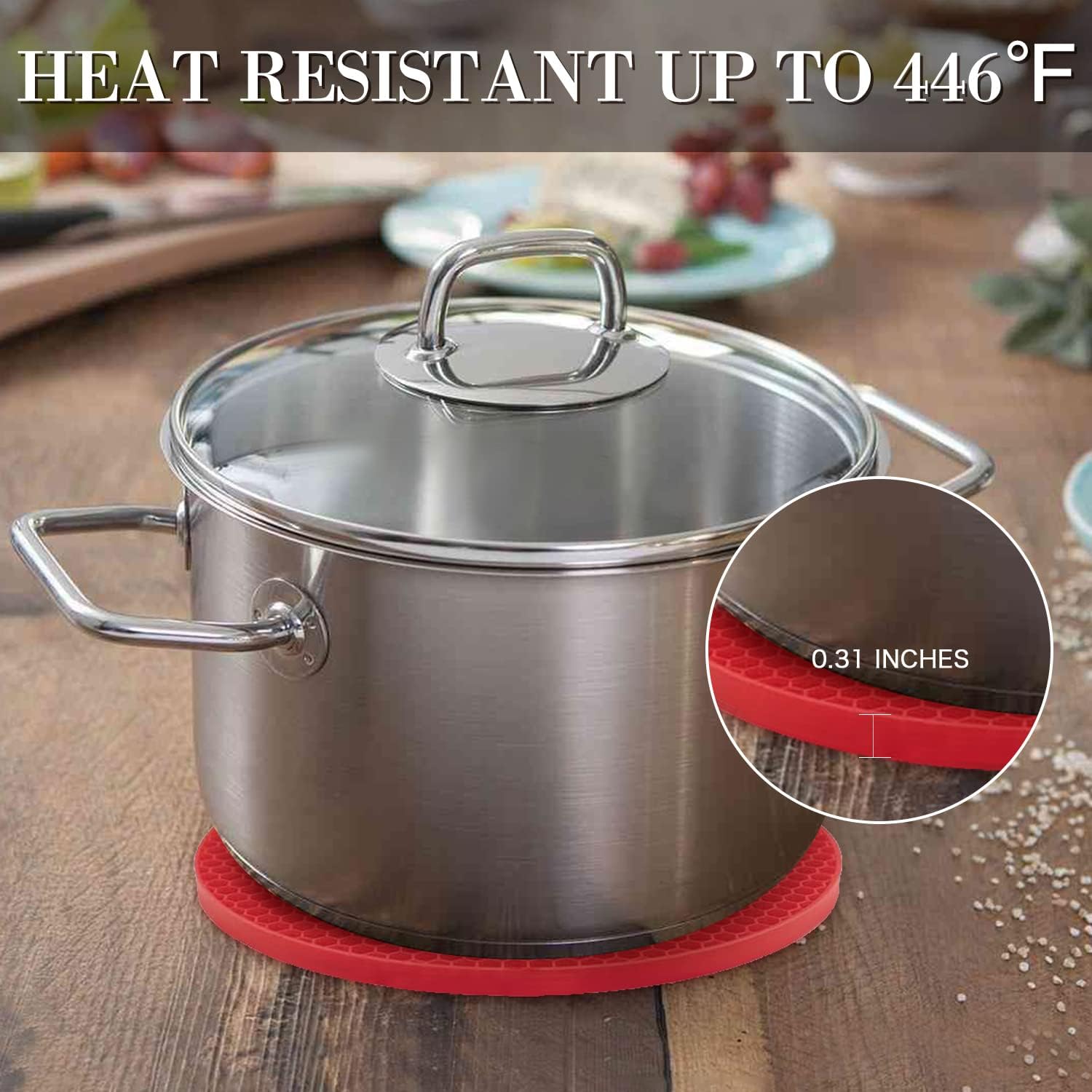 - 💝【PERFECT DESIGN &COMBINATION】:Honeycomb graphic design gives the kitchen nature symbol, means no more spills for liquids, and offers a nonslip surface; the red hot pads for table can distribute heat to protect our hands and provide insulation protects the countertop. Include 2pcs 6.9'' regular and 2pcs 8.7'' large red silicone trivets for hot pots and pans, suitable for small plates or large casseroles.