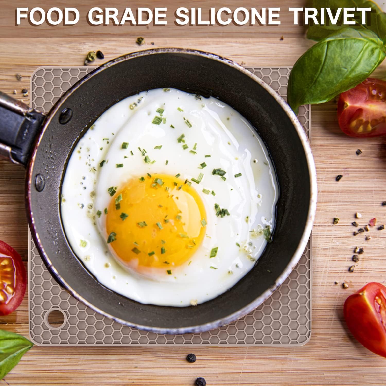 - 🎯【WIDE APPILICATIONS】 Our silicone trivets for hot pots and pans are a great helper for the kitchen. The silicone hot pads can used to be silicone placemats, small dish drying mats, bowl mats, jar openers, spoon holders, silicone grabs, garlic peelers, and large silicone coasters. The package included 2 pcs 6.88-inch round trivets and 2pcs 7.28-inch square trivets, suitable for most hot pots, pans, and dishes.