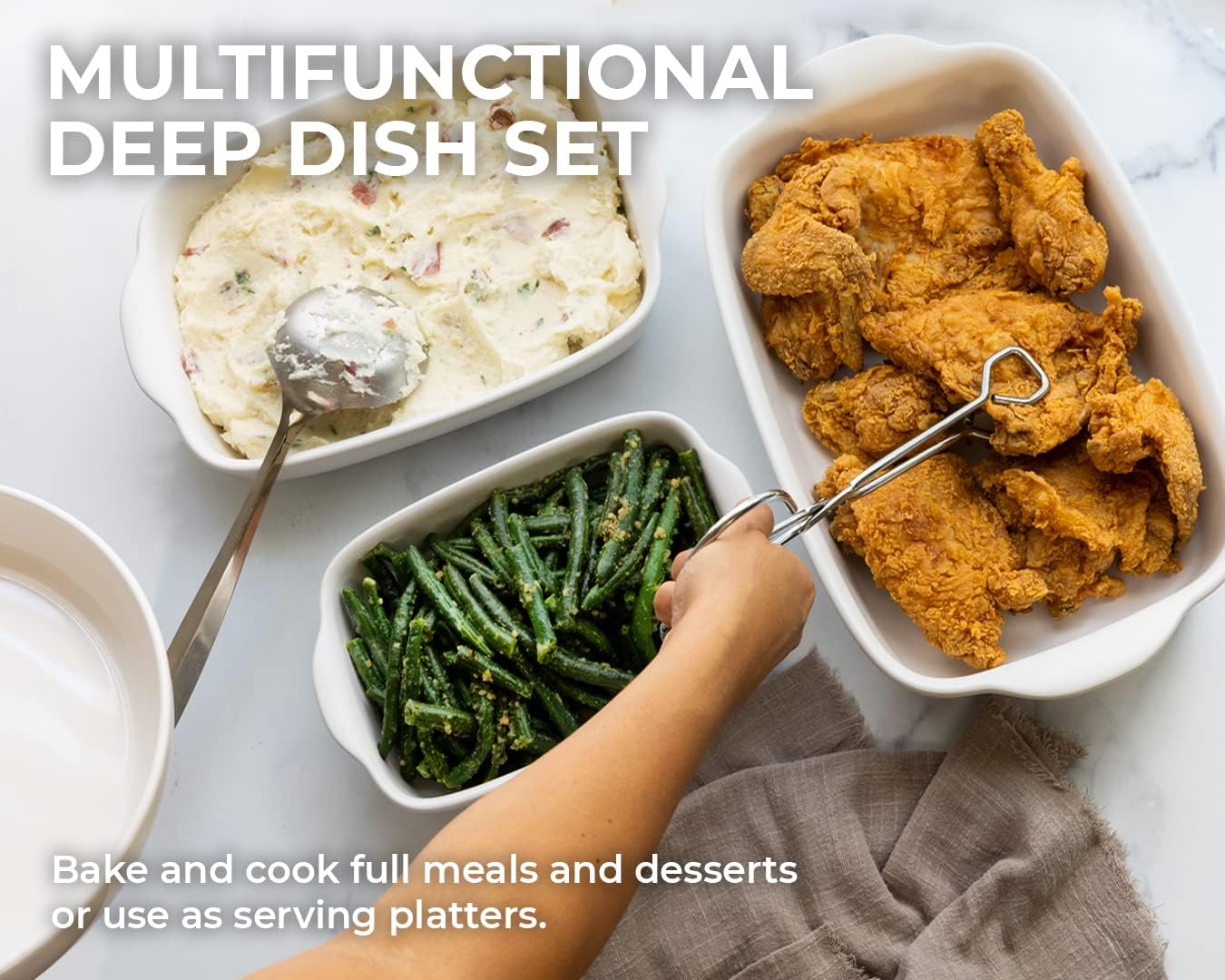 - The stunning and classic design of these oven to table serving dishes offer convenience while elevating your home dining experience. With a thoughtful design, from the non-slip handles that are easy to grip, a stackable design for easy storage that’s light to handle, a non-slip bottom, and rounded edges for ease of cleaning.