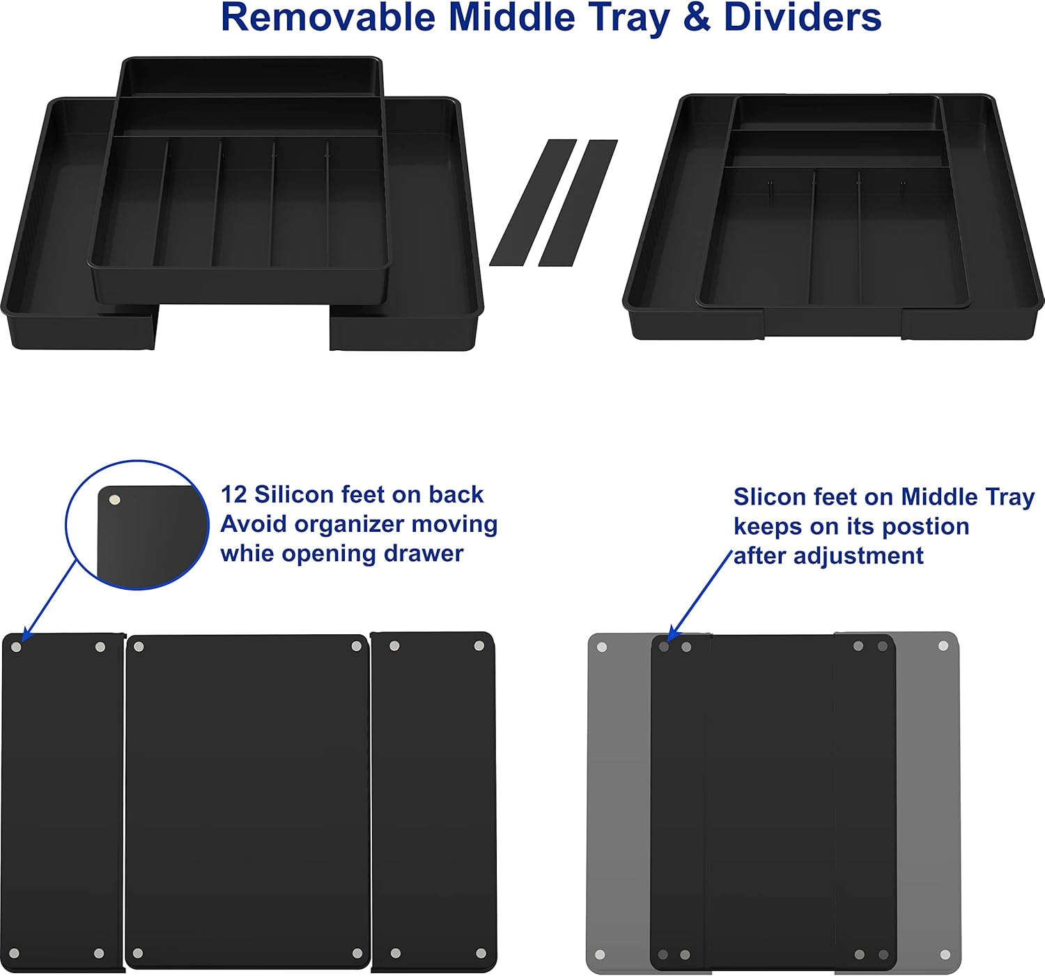 - Removable Middle Tray: Includes a detachable center tray, allowing the organizer to transform into 3 separate pieces for versatile use in different drawers.