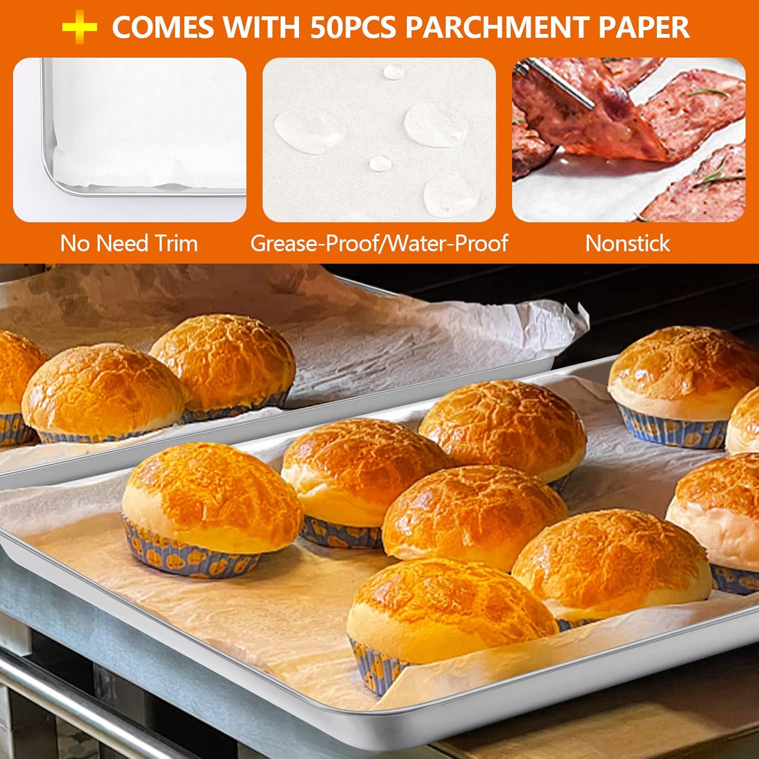 - 【2 PACK WITH 50 PARCHMENT PAPER】2 PCS baking sheets can be replaced easily, Great for broiling and roasting anything from layered sheet cake, pizza to vegetables, Comes with 50pcs grease-proof/water-proof food-grade parchment paper, No need to trim and sit perfect in the pan, Prevent sticking and easy release foods