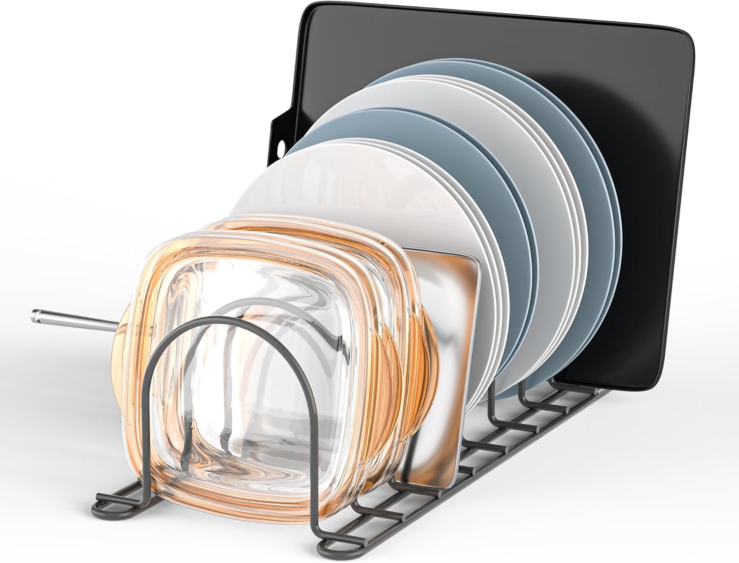 - √ 【Keep your cabinets well-organized 】The plate rack can store your pots lid,cutting board, cookie sheets , pans , bakeware , file folders,reusable bags and bee wraps orderly