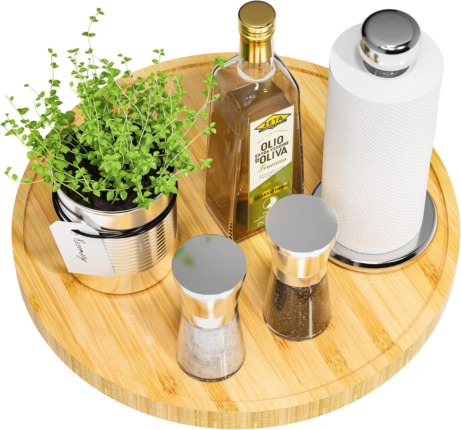 Lazy Susan for Table, 12 Inch Non-Skid Bamboo Turntable Organizer for Salt Pepper Spices and Olive Oil Next to Stove, Wooden Lazy Susan Organizer for Kitchen Countertop Organizer