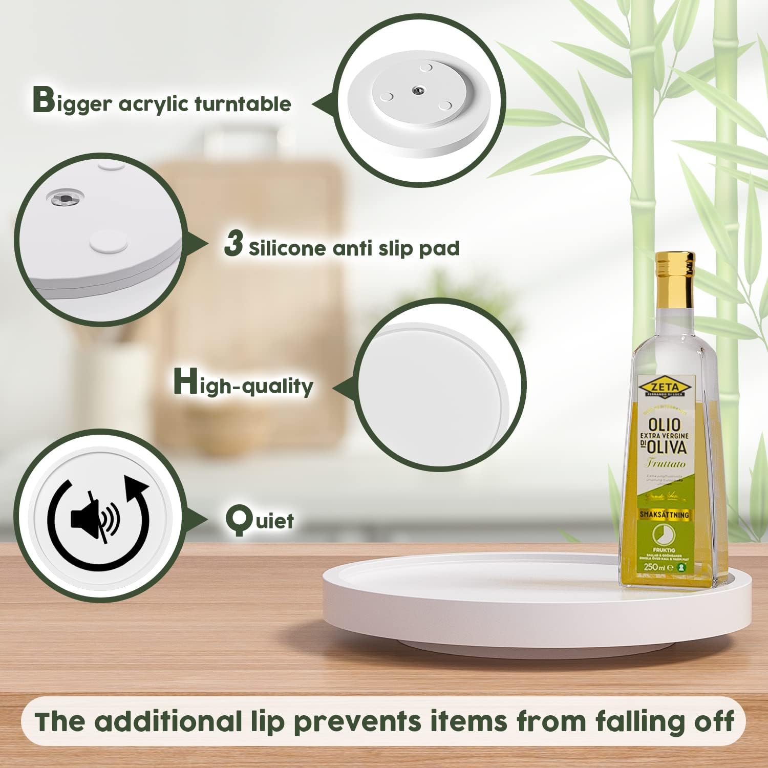 - Updated Design: Bigger acrylic turntable with 3 silica gel skid prevention pad makes lazy susan organizer rotate smoother and quieter. You can get any item from any angle. The additional lip prevents items from falling off