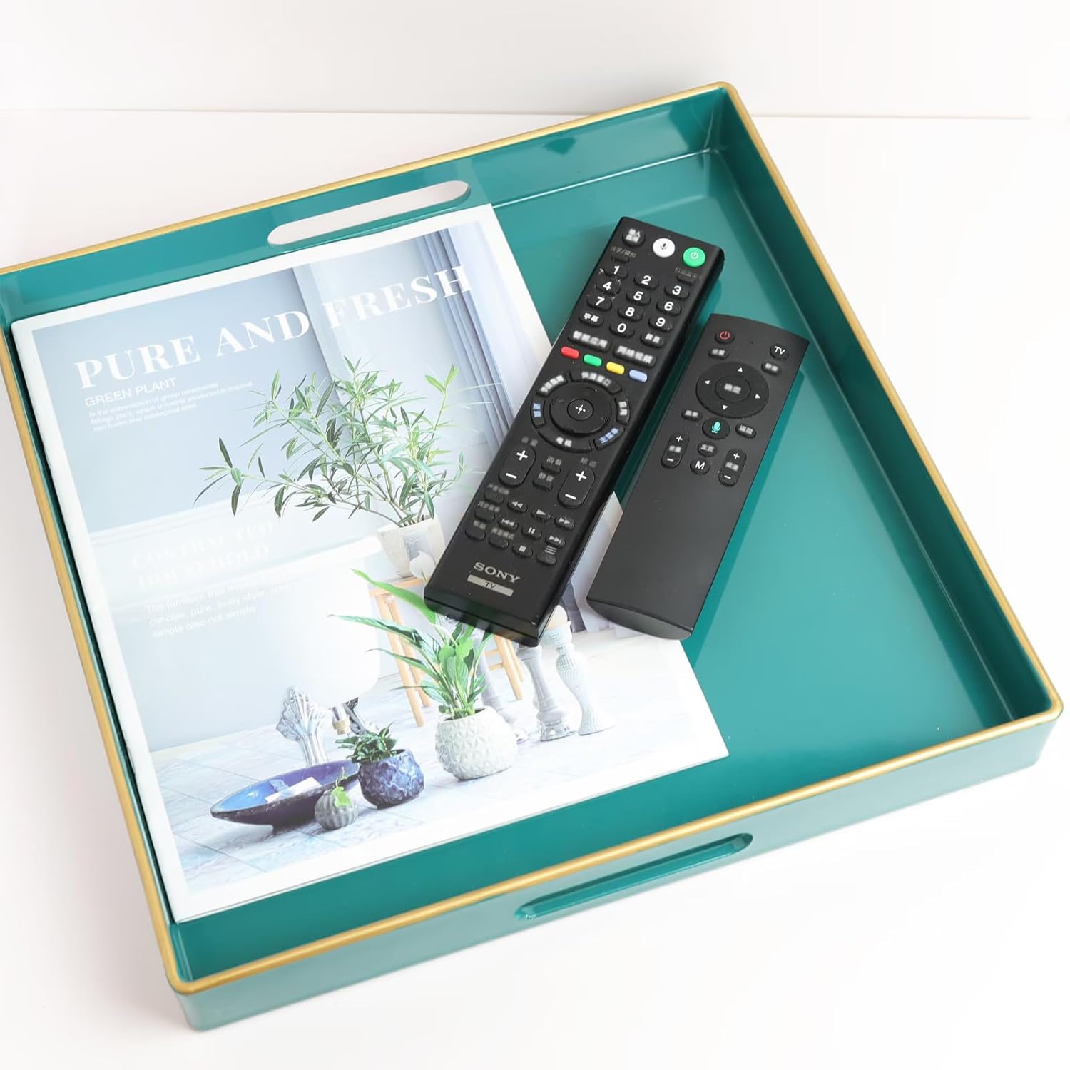 Spsyrine Green Decorative Serving Tray with Handles, 13" X 13" Square Plastic Coffee Table Tray for Ottoman, Living Room, Bathroom, Home Decor.