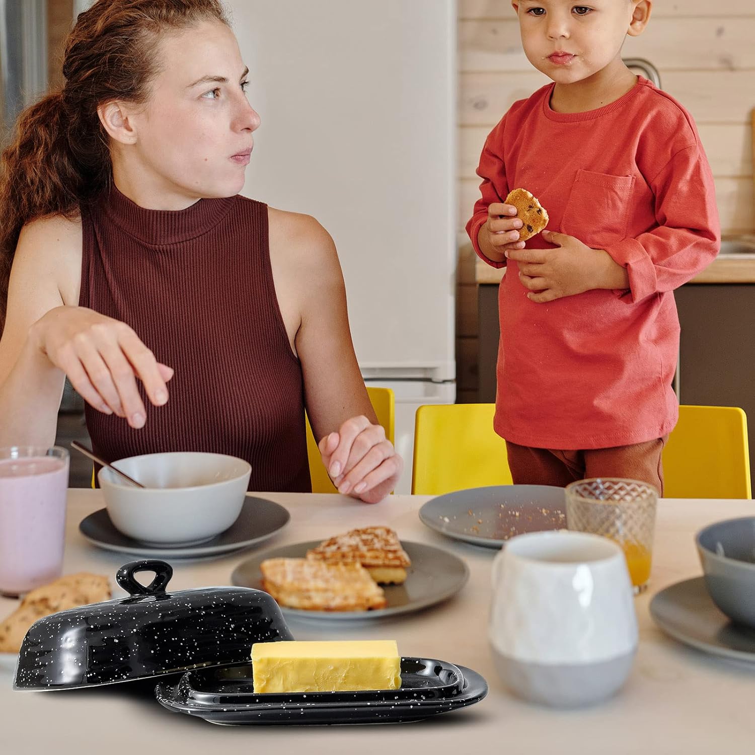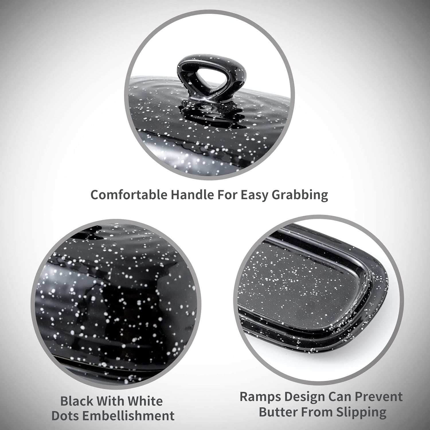 - STYLISHNESS AND ELEGANCE: The black butter dish is decorated with a unique white dot, making black no longer a constant dull feeling. The rounded edge of the butter dish cover adds an element of elegance to any countertop.