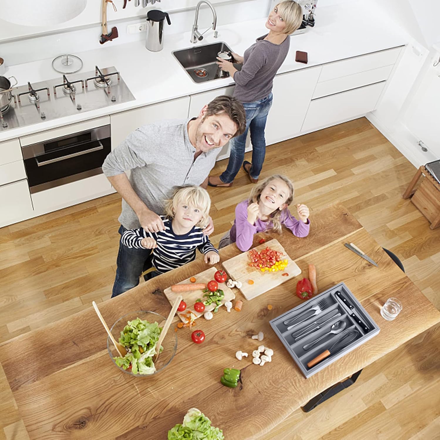- Clutter-free Storage: Your expandable drawer organizer with 5-7 compartments serves not only as a cutlery organizer in drawer to store flatware and silverware like forks, knives and spoons, but also as a kitchen drawer organizer for large utensils like ladles, tongs and whisks. Keep all the kitchen gadgets in the right place and make the cooking hassle-free with your drawer organizer, so that you can save time and effort for fun things during the cooking.