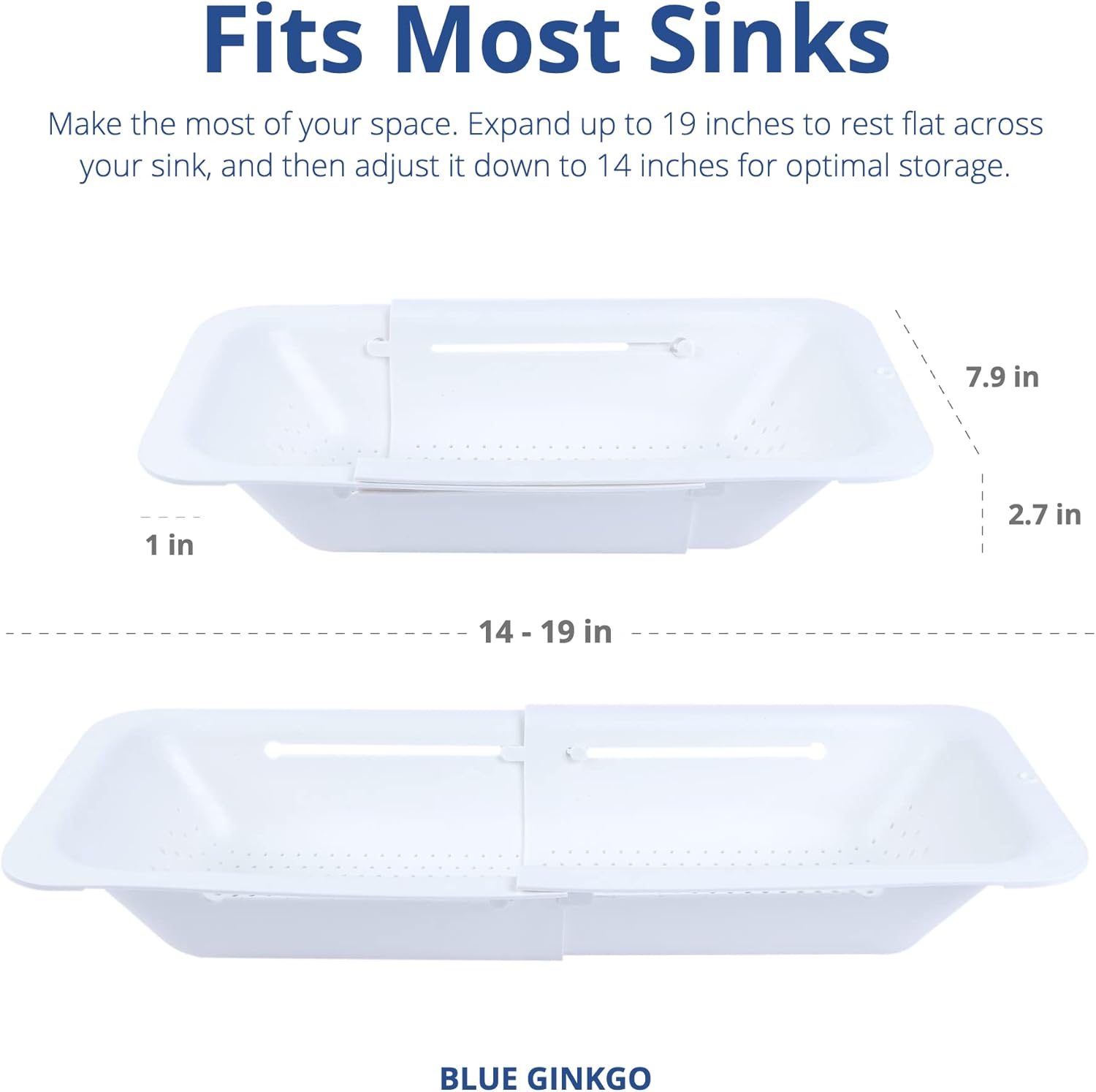 BLUE GINKGO Sink Colander Baskets - (Pack of 2) Wash Vegetables and Fruits, Drain Cooked Pasta and Dry Dishes - Extendable - New Home Kitchen Essentials (2 White)