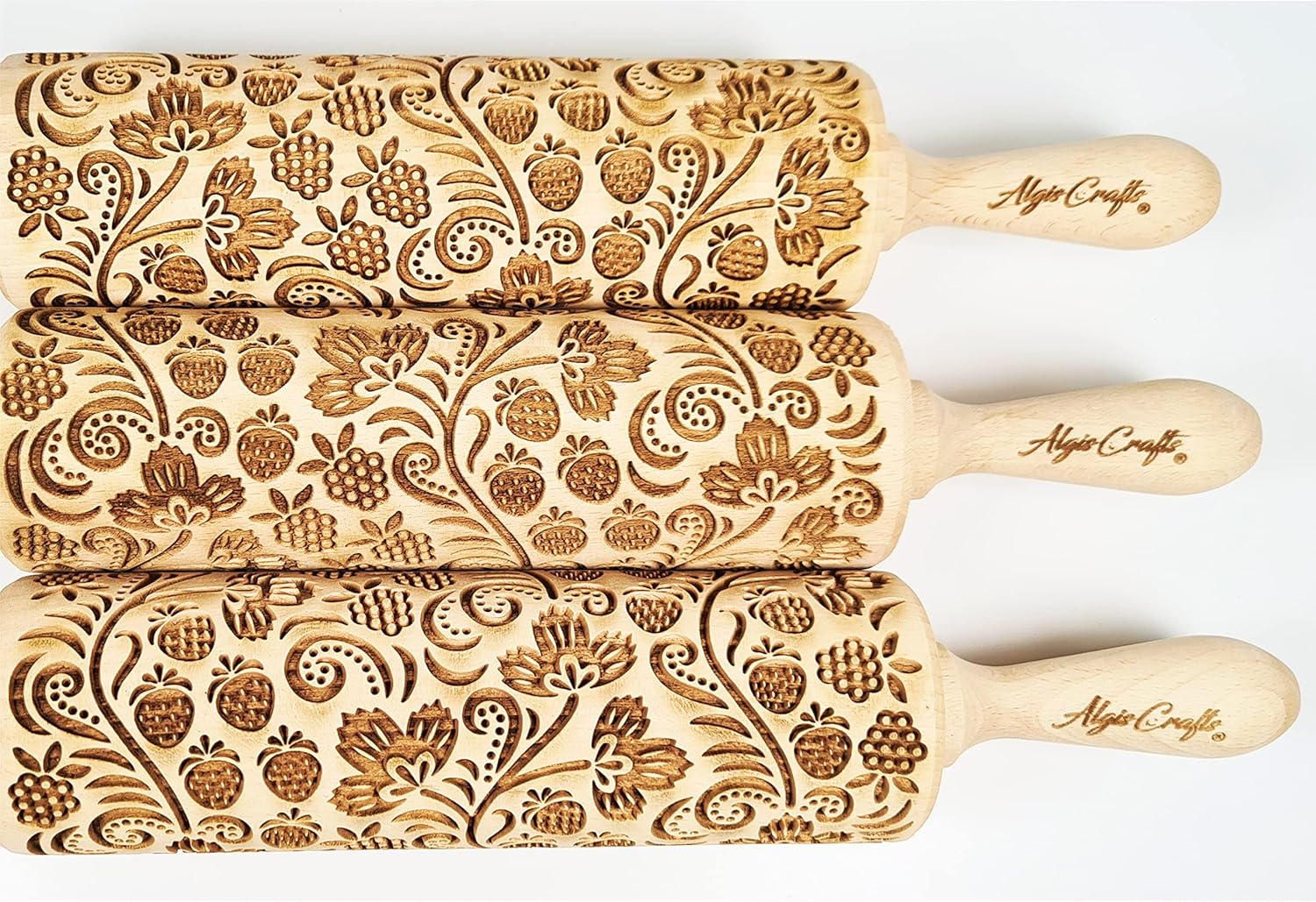 - Use beautifully handmade and finished beech wood kitchen accessories to bring your regular bakes to life with stunning patterns! Crafted from natural wood, this rolling pin features a deep, clearly defined pattern emboss to create stunning home-baked goods, crafts, and pottery!