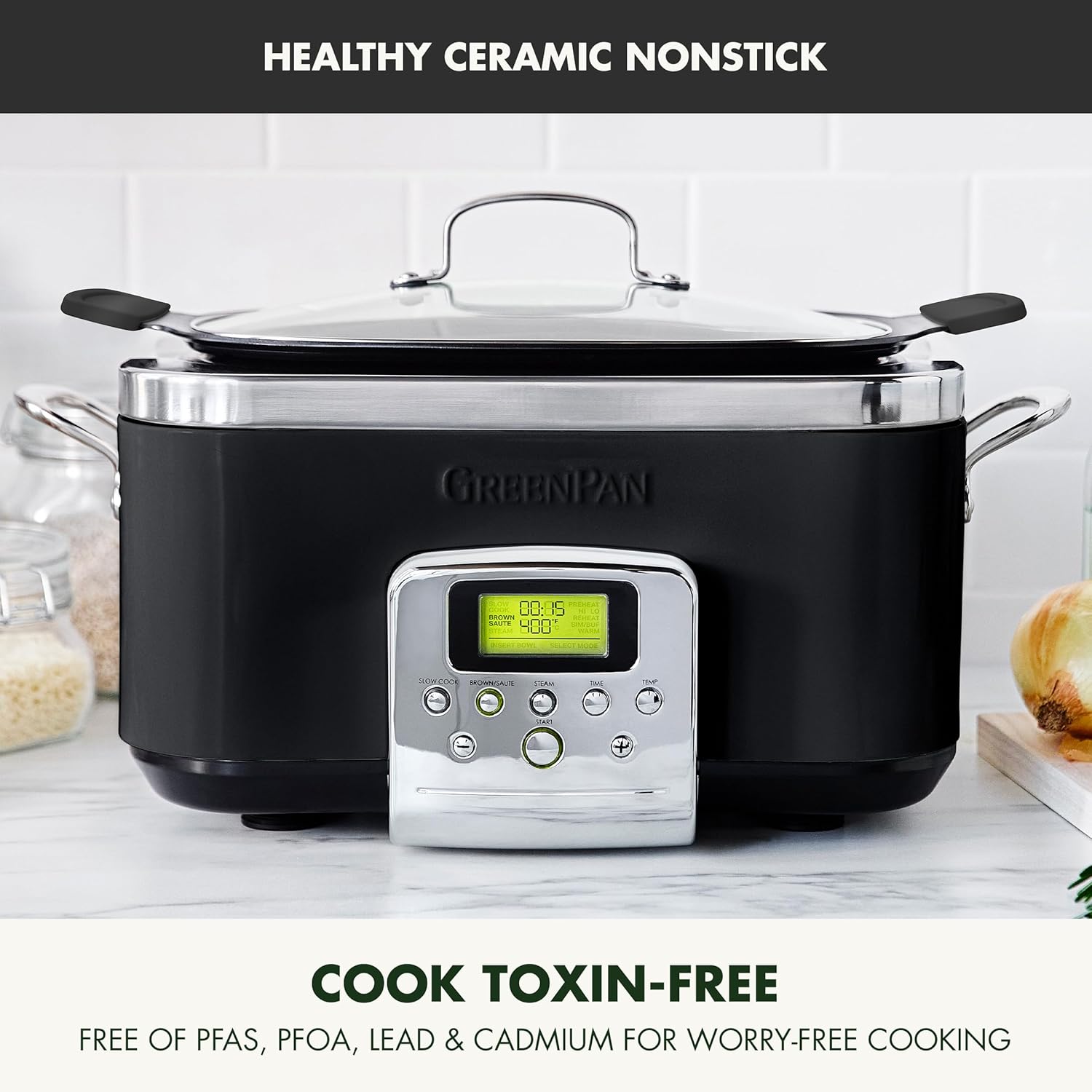 GreenPan Elite 14-in-1 Programmable 6QT Electric Slow Cooker, Dishwasher Safe Lid & Removable Crock, PFAS-Free Healthy Ceramic Nonstick Multi-Cooker, Sear, Sauté, Brown, Steam Basket, Roast, Black