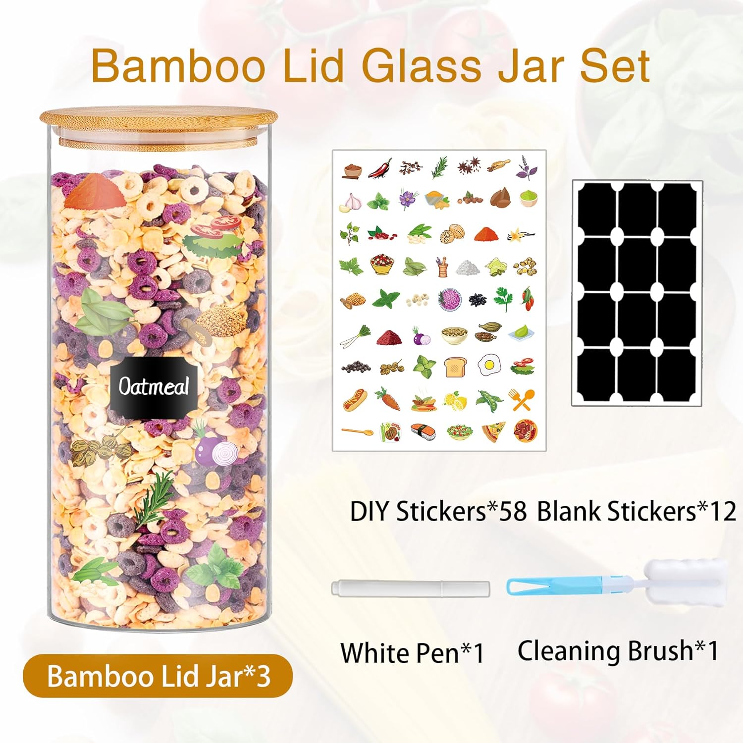 - 【Value Kitchen Jars Set】Get 3 durable 58oz glass pantry storage containers set with airtight bamboo lids (4.03"×10.1"), 58 pre-printed + 3 blank labels (with marker), and a cleaning brush. Perfect for storing dry goods, crafts, or bathroom essentials.