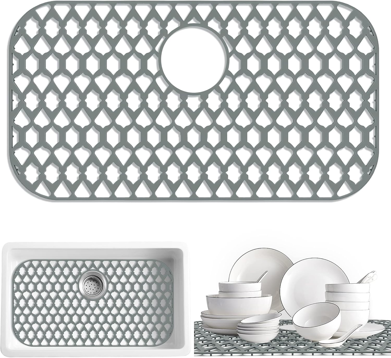 Sink Protectors for Bottom of Kitchen Sink 13x11 &16x12 &19x14 &21x16 &22x13 &24x13 &28x14 &30x16, Large Farmhouse Silicone Mats Grid (26”x14”, Rear Drain)