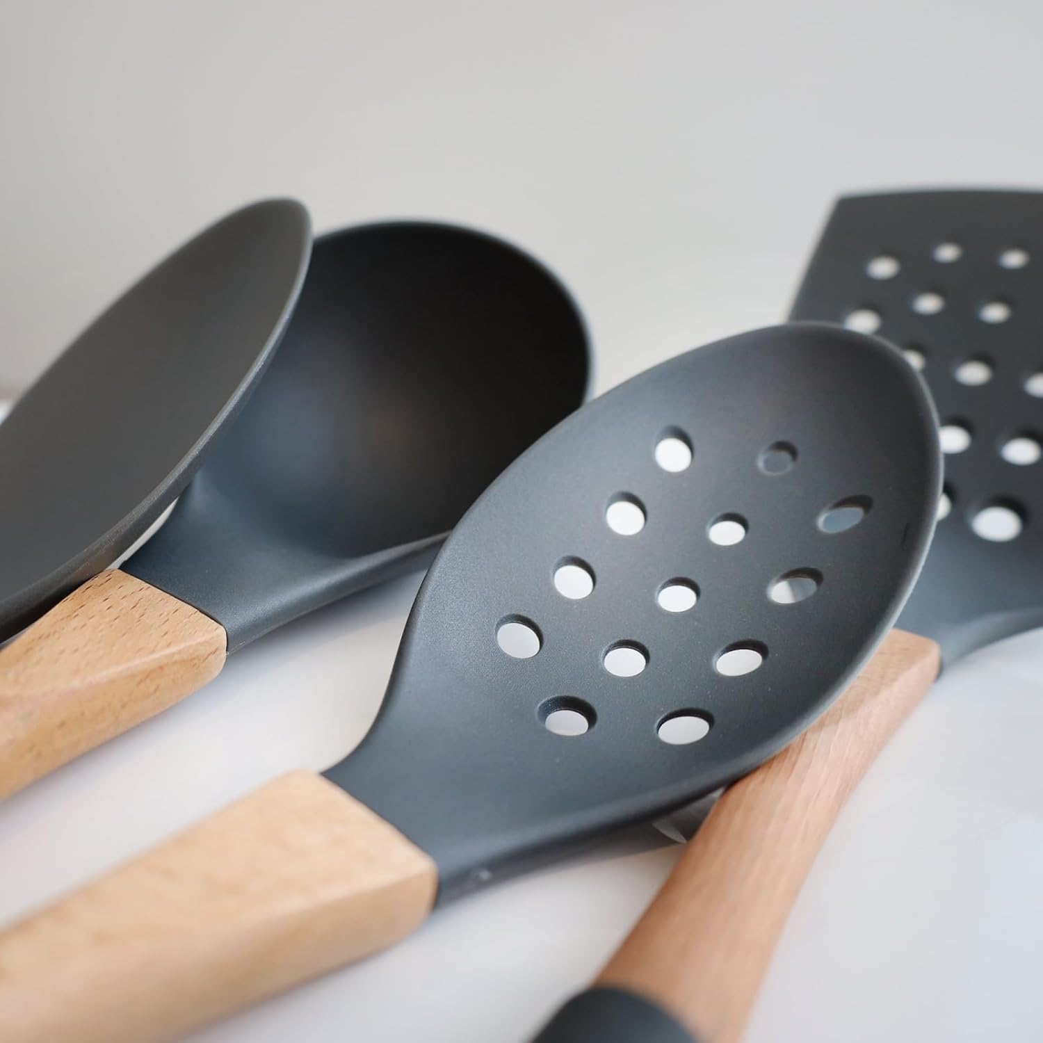 Beille Grey Nylon Slotted Spoon with Wooden Handle Kitchen Utensils High Heat Resistance, 13 Inch