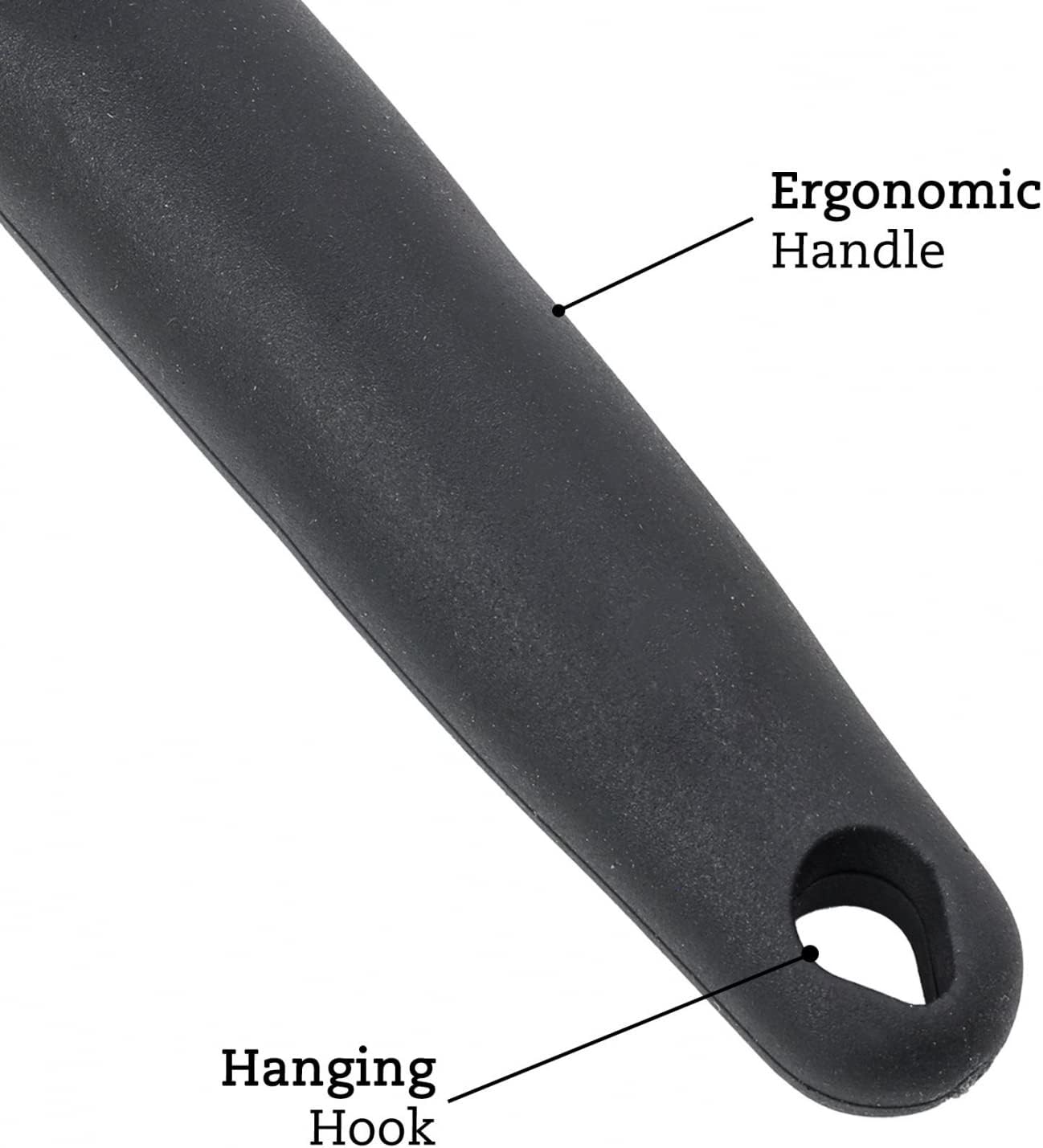 - ERGONOMIC WOODEN HANDLE: Sturdy handle made of durable wood so you can count on it to last and ergonomic handle provides comfort during use; Comes with handy slot in handle for easy hang storage if preferred; Trendy grey color will fit nicely with any kitchen decor