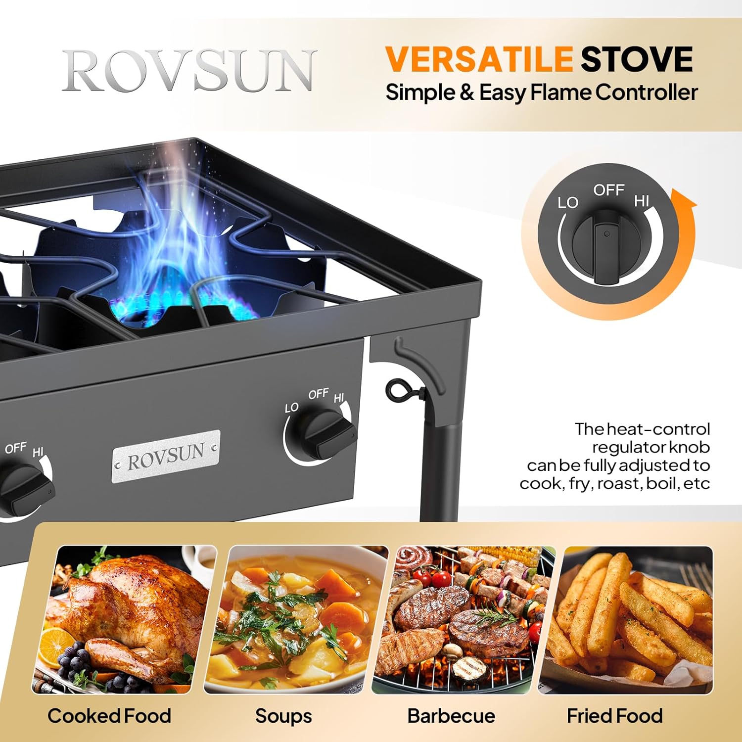 - 225,000 BTU β Stove give off a strong flame that can be adjusted easily. Heat is controlled by a CSA approved regulator, which is more safety and longer working time. Three burner make it possible to cook more food at the same time, 75,000 BTU for each burner.