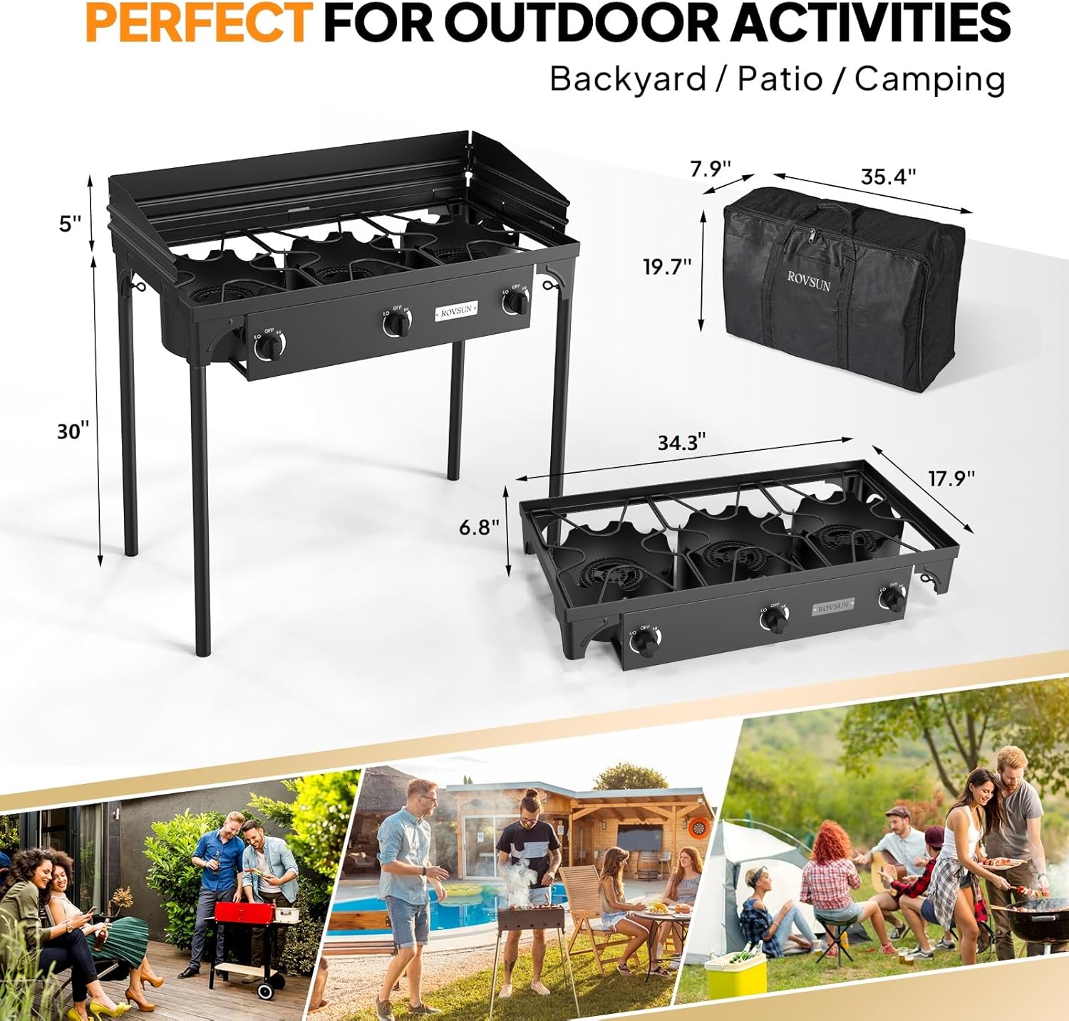 ROVSUN 3 Burner Propane Gas Stove with Carrying Bag, 225,000 BTU Patio Outdoor Camping Burner with Wind Panel & CSA Listed Regulator, Picnic Cooker for Home Patio Cooking Brewing Turkey Frying Canning