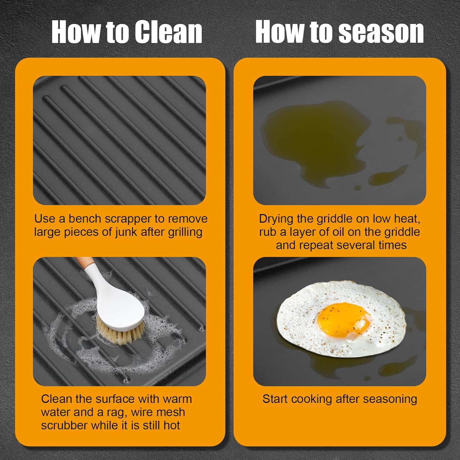 - Tips for Use - Please use a thin layer of grilling spray to avoid any sticking. Give it a little oil before you store it in a dry and ventilated environment which can extend the life of the griddle.