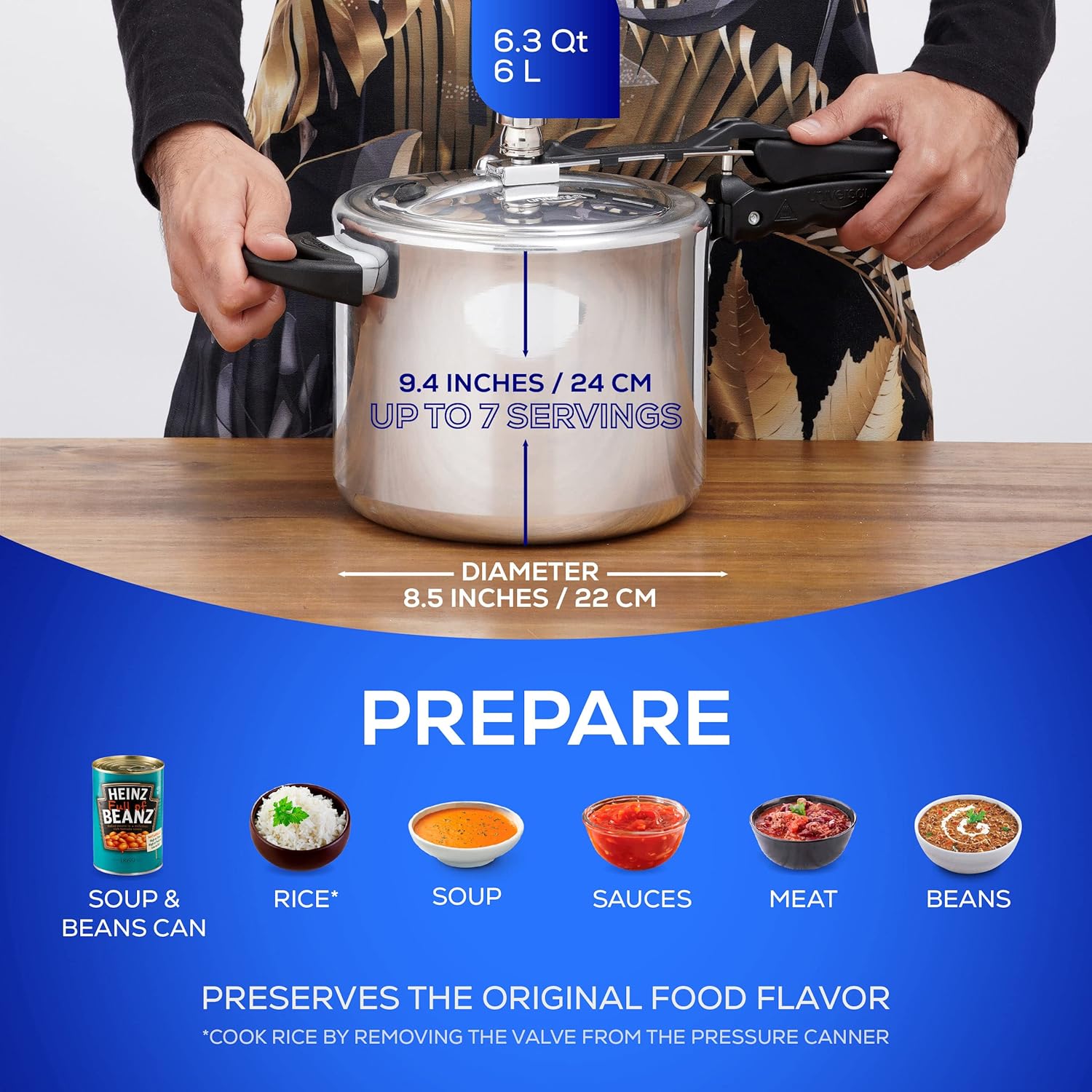 - Durable 6.3 Qt Aluminum Pressure Cooker – Inner Lid System for Secure Sealing: This high-quality 6.3 Qt (6L) aluminum pressure cooker features a traditional inner lid closure system for safe and efficient cooking. Its heavyweight build ensures stability at 11.60 PSI (80 kPa) with extra safety mechanisms. IMPORTANT: To insert the lid, align the lid arrow with the body handle, tilt and slide it in, turn the handle, place it on the pivot, squeeze both handles together, and adjust for a perfect seal.