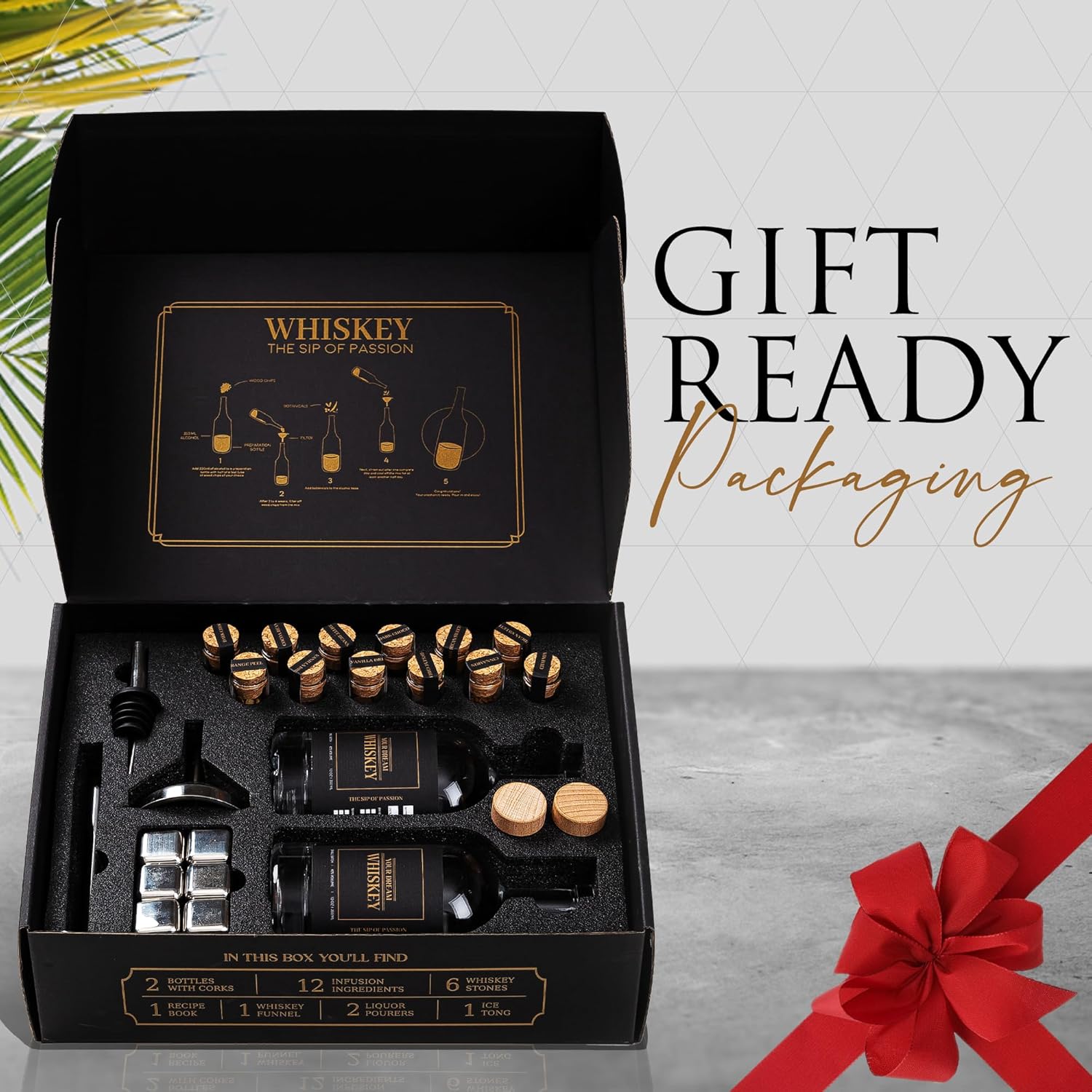 - THE ULTIMATE WHISKEY GIFTS FOR MEN UNIQUE โ A whiskey loverโs dream! This whiskey infusion kit includes 2 glass bottles, wood chips, botanicals & whiskey stones, all in a sleek, gift-ready box. A top whiskey gift for men, perfect for husbands, dads & whiskey connoisseurs.