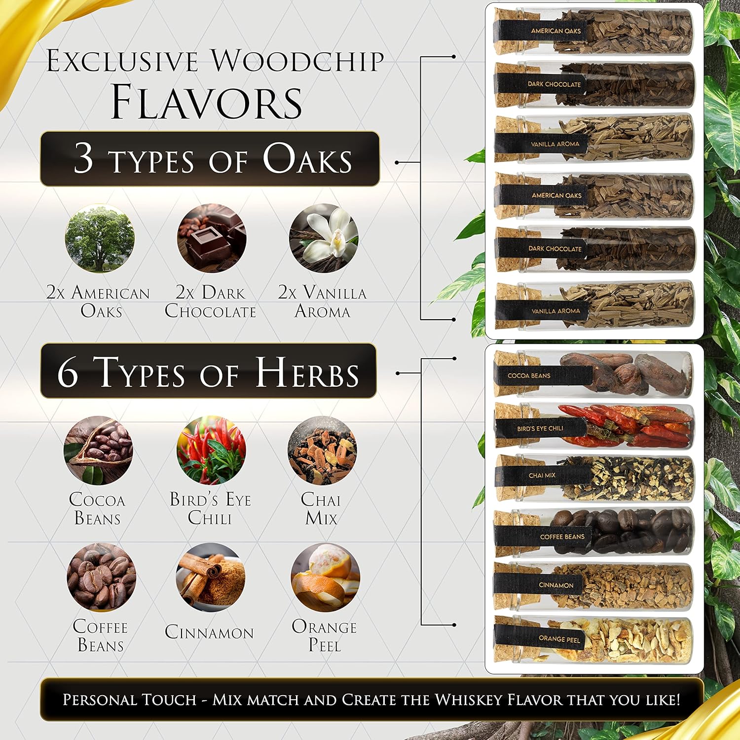 - MAKE YOUR OWN WHISKY โ CUSTOMIZE YOUR FLAVORS - Blend bold flavors like dark chocolate, orange peel, coffee beans & Birdโs Eye chilis to create your own signature whiskey. Whether for Old Fashioneds or new bourbon blends, this whiskey flavoring kit is a must-have.