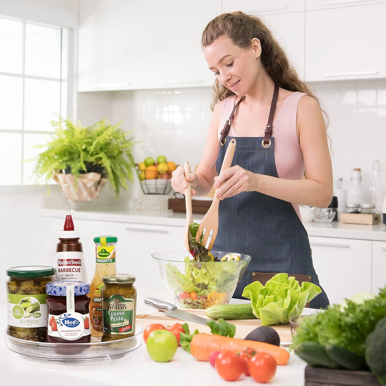 - PREMIUM QUALITY & SECURE - This spinning organizer is made of premium durable PE and BPA-free plastic, thick and not brittle, offering a long-term durability and safety for food, which is easy to clean with mild soap and water. NOTE: DON'T PUT IT IN DISHWASHER