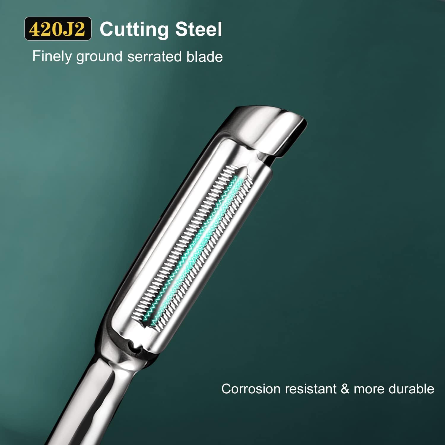 - 【Super Sharp & Swivelling Blade】Vegetable peelers for kitchen, the serrated blades are made of professional 420J2 cutting steel, which are extremely sharp and durable. The swivel blades perfectly fit the curves of fruits or vegetables, peel thin and reduce food waste.