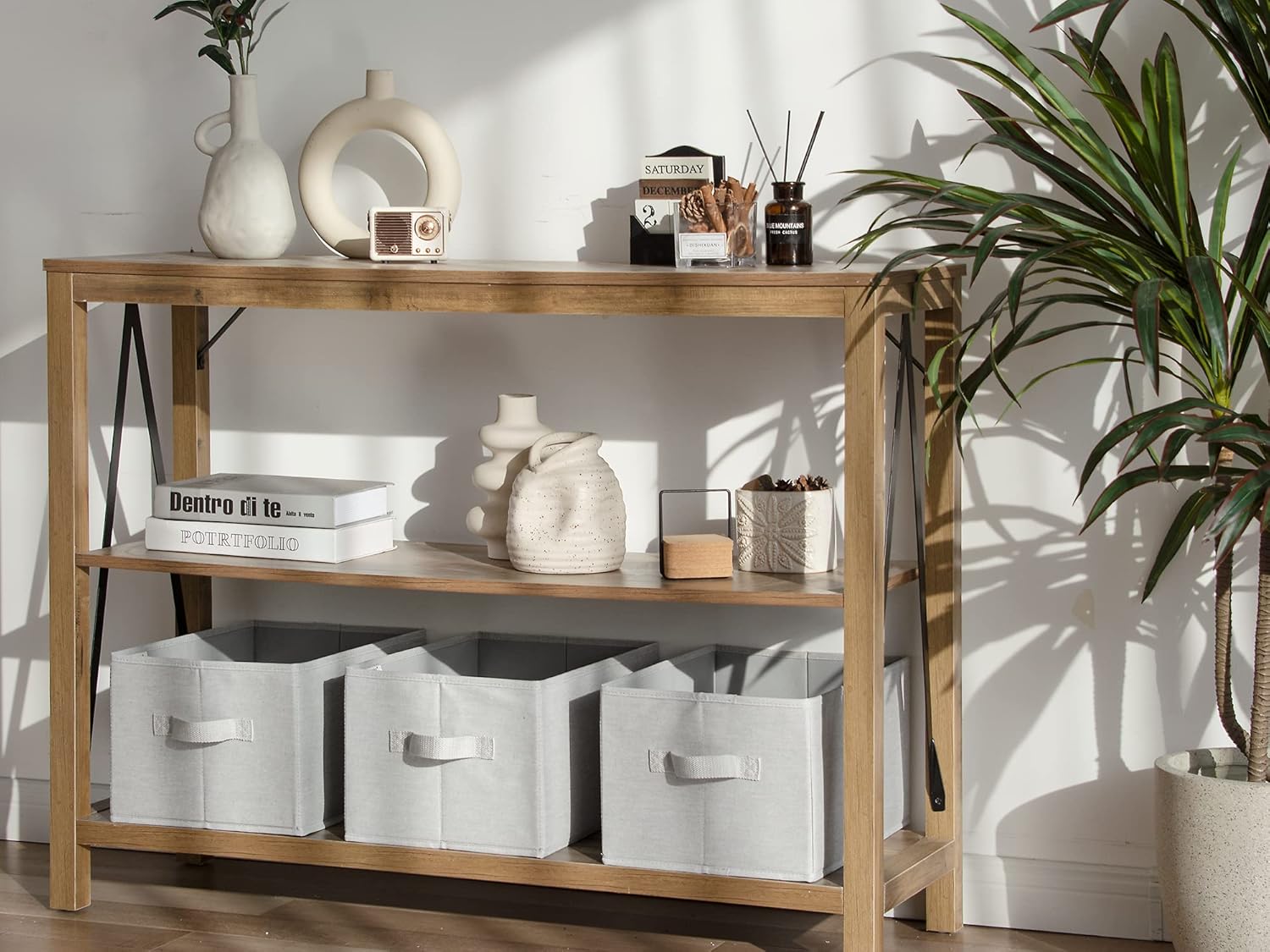- The storage baskets for shelves are collapsible for compact storage when not in use.