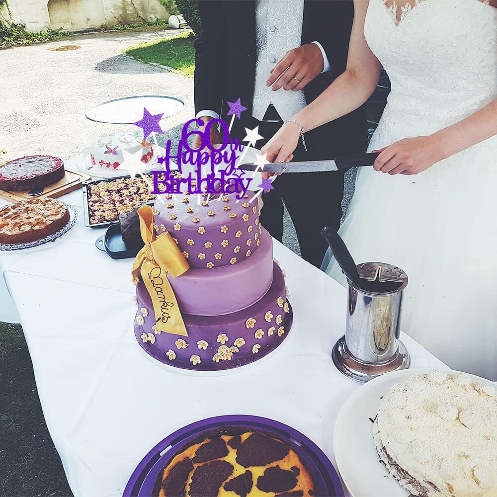 Glittery 60th Happy Birthday Cake Topper with Star,Personalised 60 Birthday Cake Toppers Party Decorations Party Supplies for Men Women Purple Silver