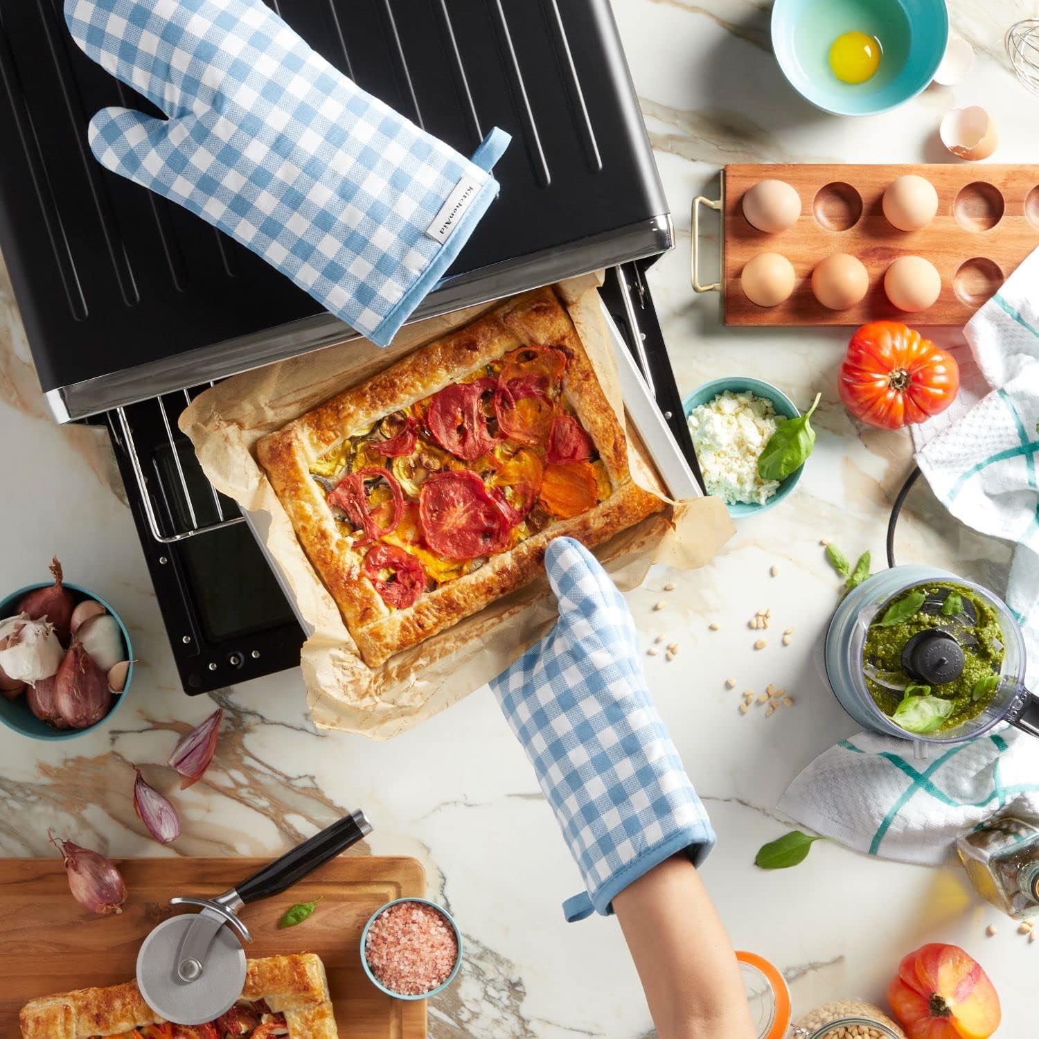 - SET OF TWO: Set includes two (2) KitchenAid Gingham Oven Mitts with a classic checkered pattern, each measuring 7" W x 13" L.