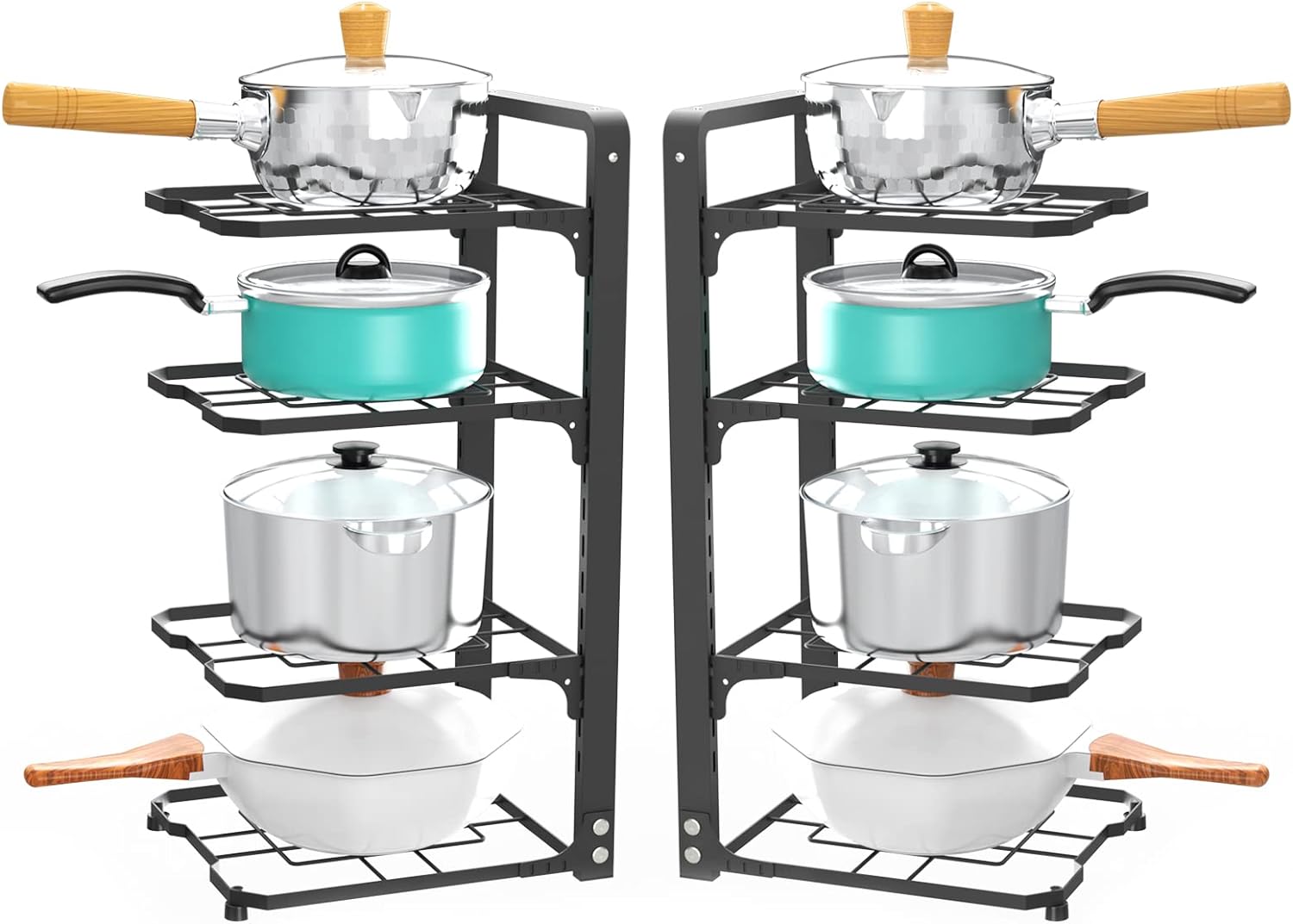 - [Adjustable Tiers] Customize each tier position according to your pan and pot heights. You can quickly get out a heavy iron skillet from the shelf. Fit all sizes of pans. Also a good pot lid organizer for cabinet.