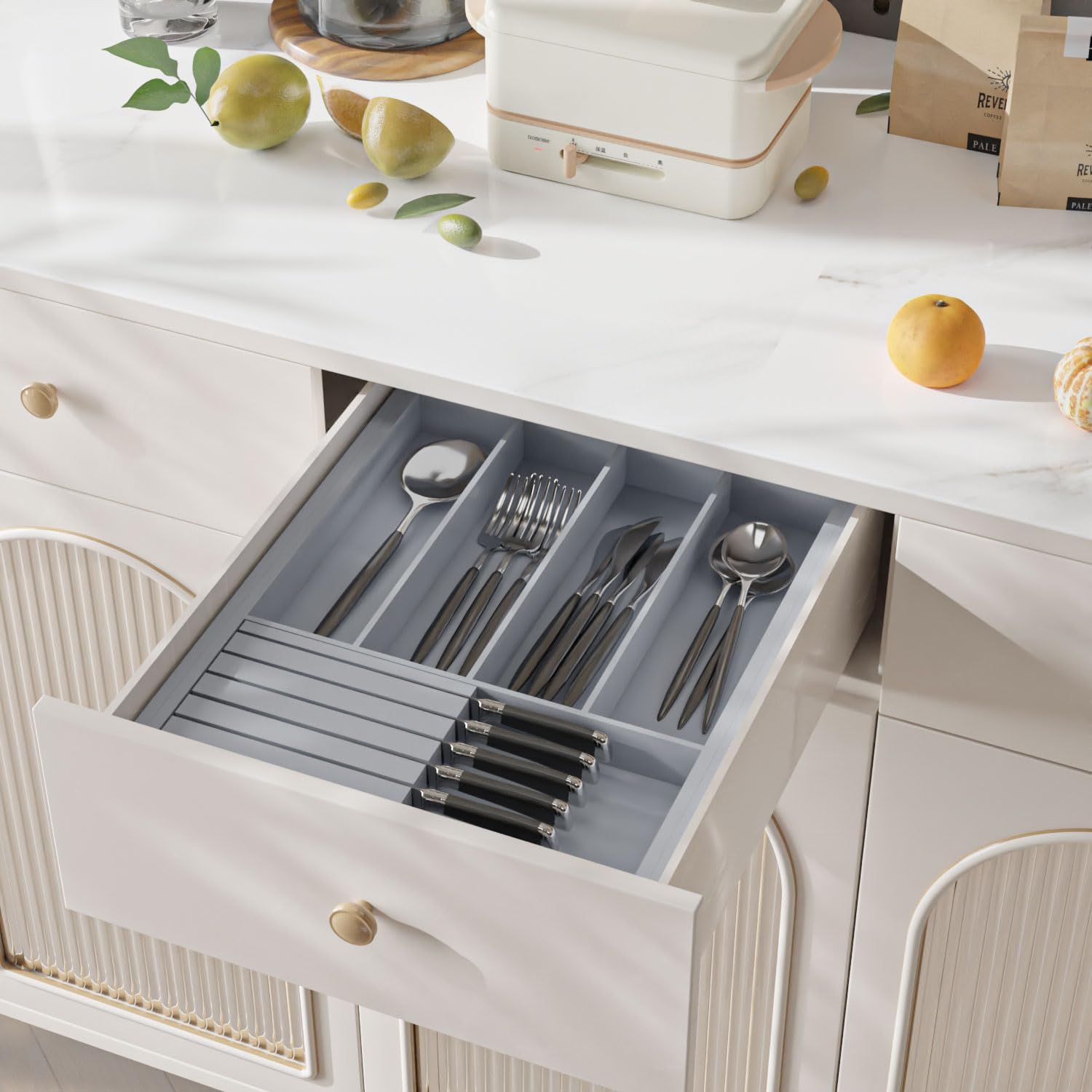 - 【Expandable on Both Sides】: The closed size of the drawer organizer is 12.8*16*2 inch, and the width can be expanded to 20.2 inches. Suitable for drawers above 13*17*2 inch. Please confirm the drawers size before purchasing, our large utensil drawer organizer can expand according to the kitchen cabinet and fill the drawer.