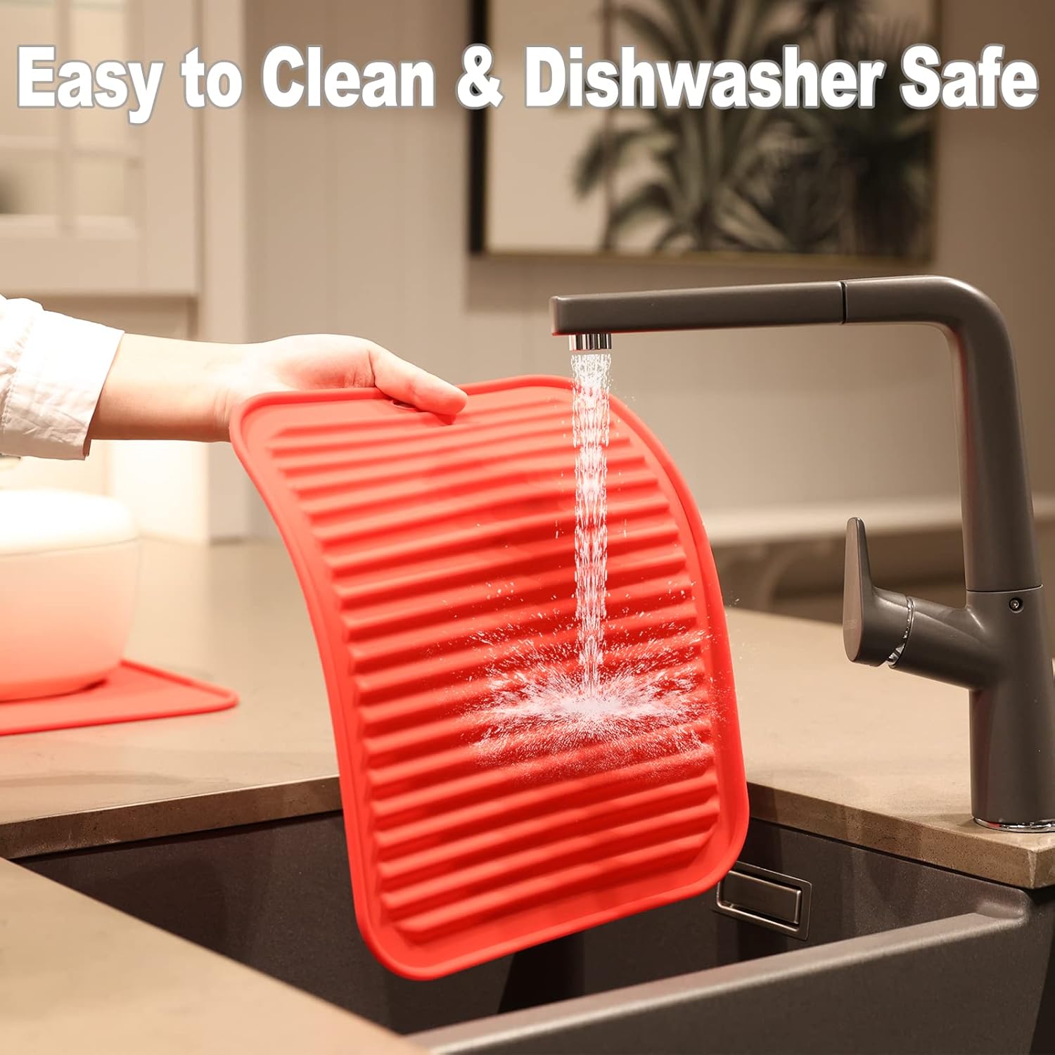 - EASY TO CLEAN & DISHWASHER SAFE - These trivets for quartz countertops are waterproof, plus stain and odor resistant. These kitchen hot pads are safe to pop in the dishwasher. It is non-stick and easy to clean. Roll up or hang on hook, save space. Experience a more convenient kitchen environment with these silicone trivet.