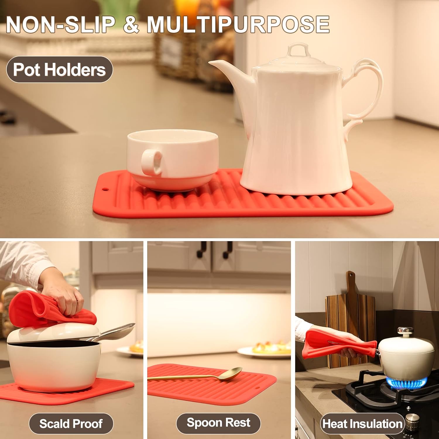 - MULTIPURPOSE KITCHEN TOOLS - Our silicone trivets for hot dishes are non-slip, flexible and soft enough to comfortably grab hot pots and pans, jar opener, drying mat or potholders. Silicone hot pads for kitchen are perfect for use in an oven, microwave, or freezer, protect your hands from hot and cold.