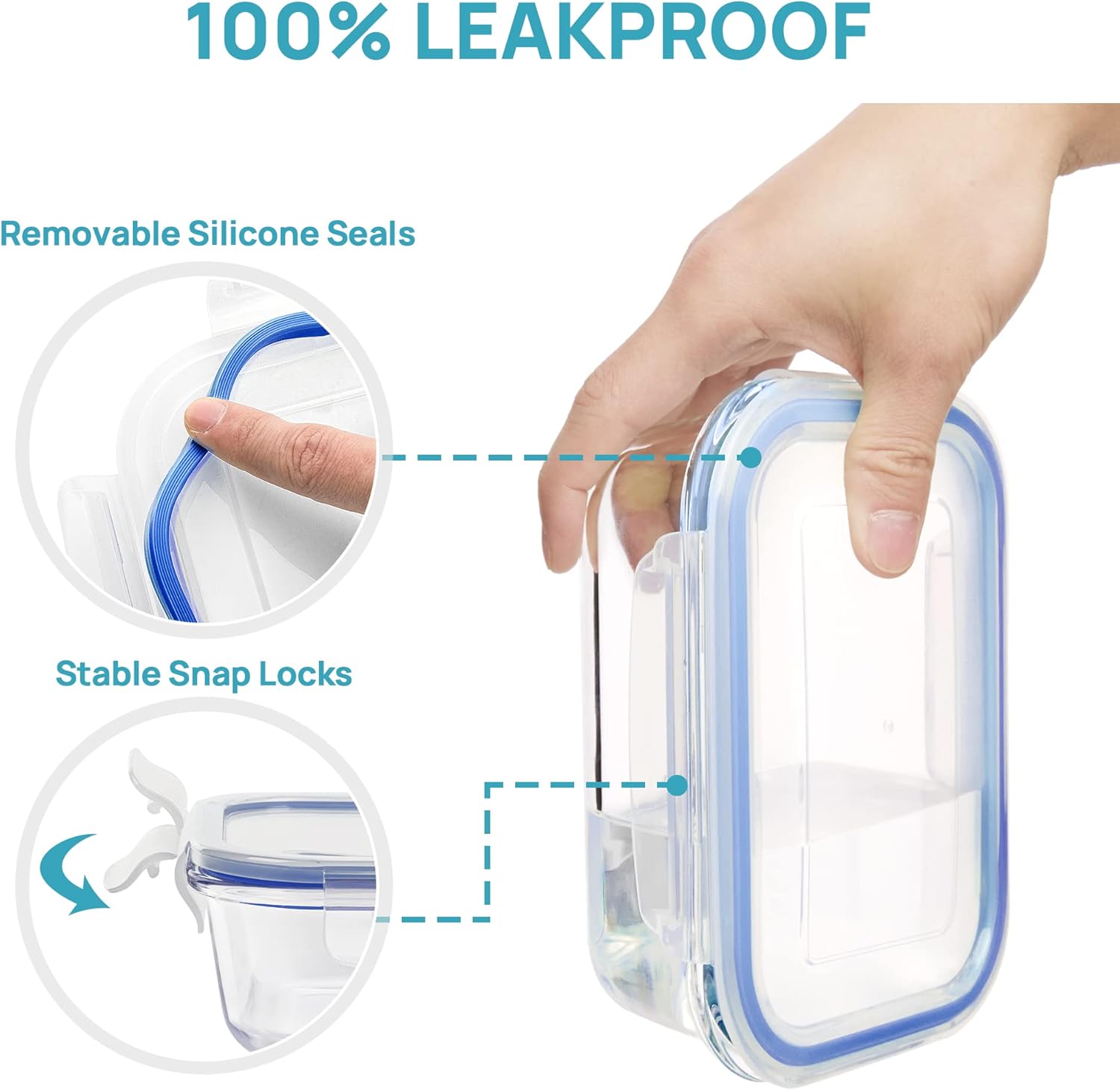 - 【100% Leak Proof Airtight Lid】Glass food containers is designed with removable silicone seals and 4-hinge snap locks to ensure zero leaking or spilling, which also prevent smell go out and keep food fresh.