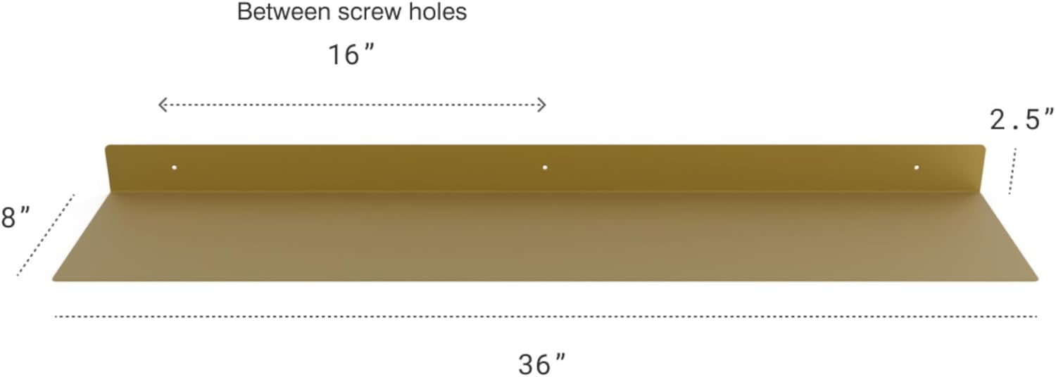 - DIMENSIONS & DETAILS: Measuring 36-inches long x 8-inches in depth, our steel floating shelf is made from 14 gauge raw steel and professionally powder coated gold. The weight of the shelf is 8 LBS. It's perfect for displaying books, plants, bottles, picture ledges, and retail displays