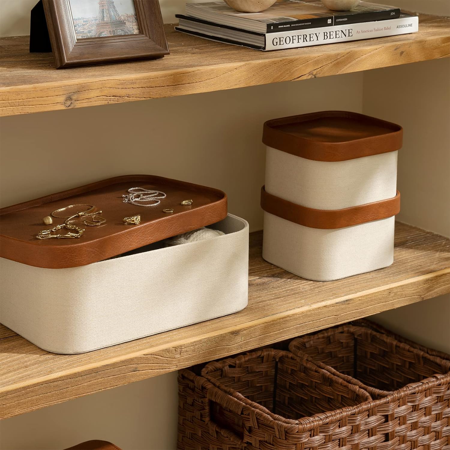 - SMART STORAGE - Every storage bin has a PU lid with a raised rim on each side. The lid can double as a tray for jewelry and other small accessories. This set of storage boxes comes in 2 different sizes, suitable for the living room, bedroom, and dresser to make your place neat. Size (inch): L-12.6L×7.9W×4.7H, S- 7.1L×5.9W×4.1H (Including lids)