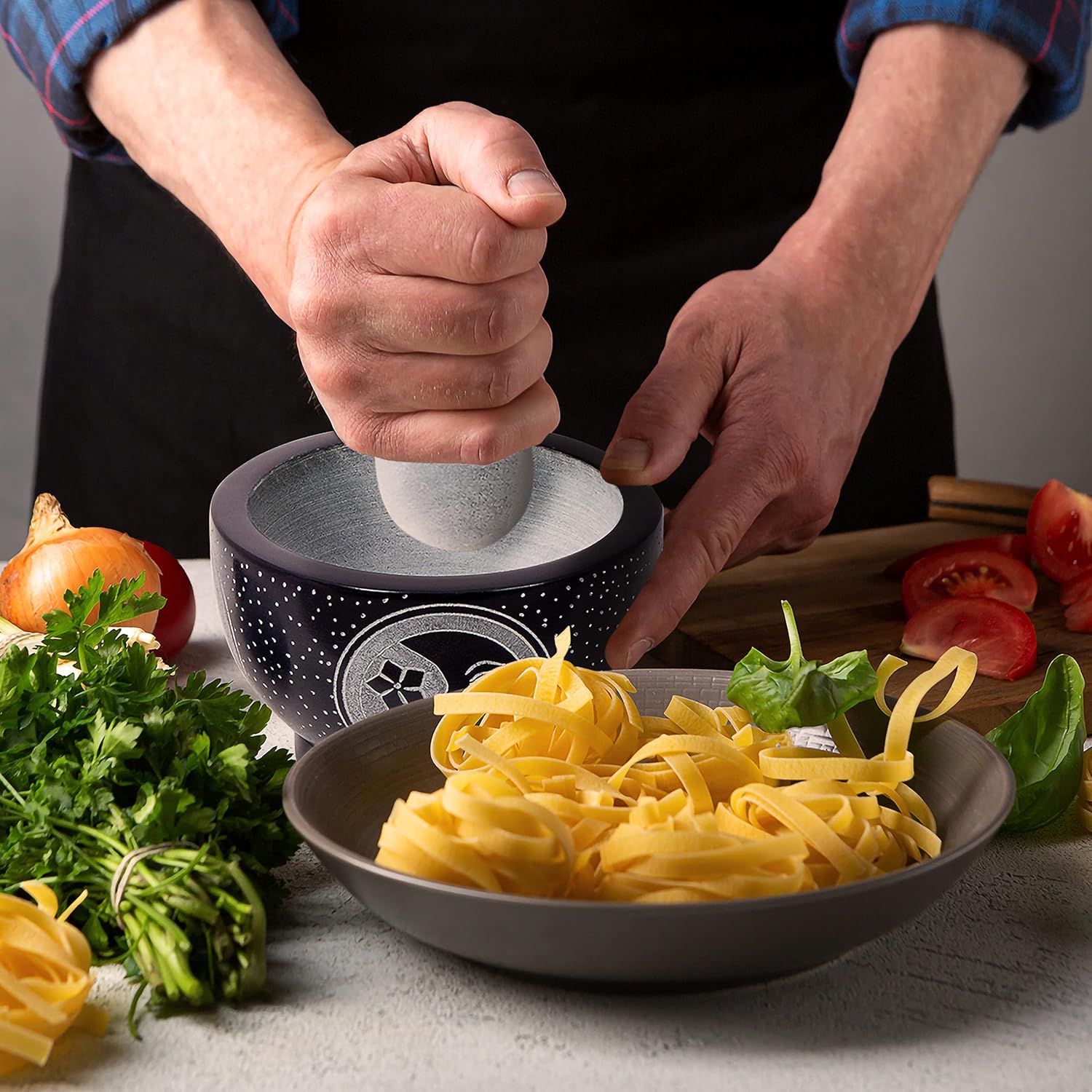 - THE PERFECT BLEND OF FORM AND FUNCTION! - The mortar and pestle have been used for centuries as the perfect way to grind and mix ingredients. Crafted from sturdy material, this mortar pestle comes with a unique crescent moon and star design and makes for a beautiful decor piece when not in use.