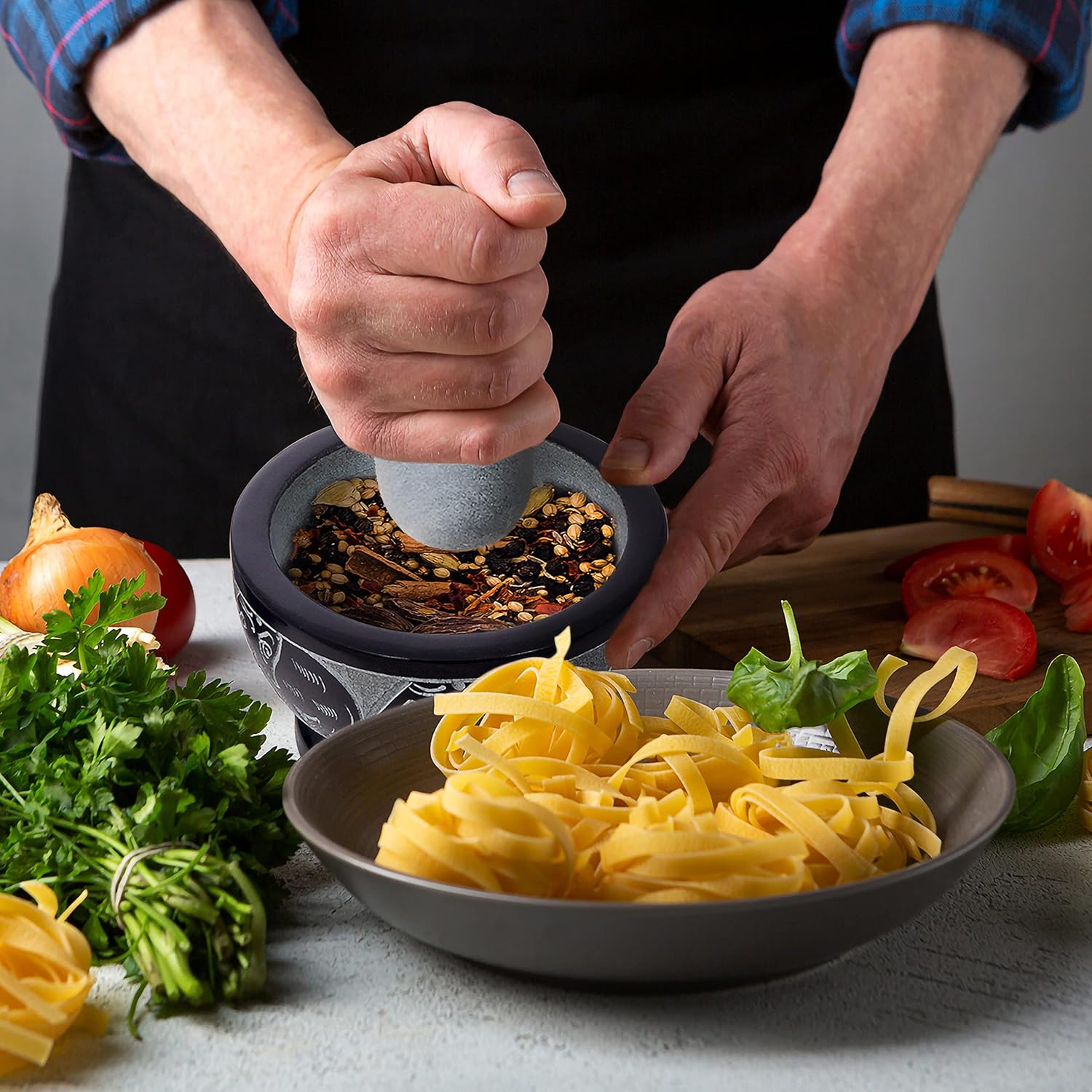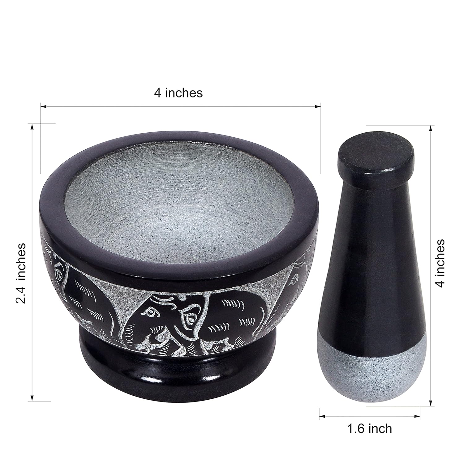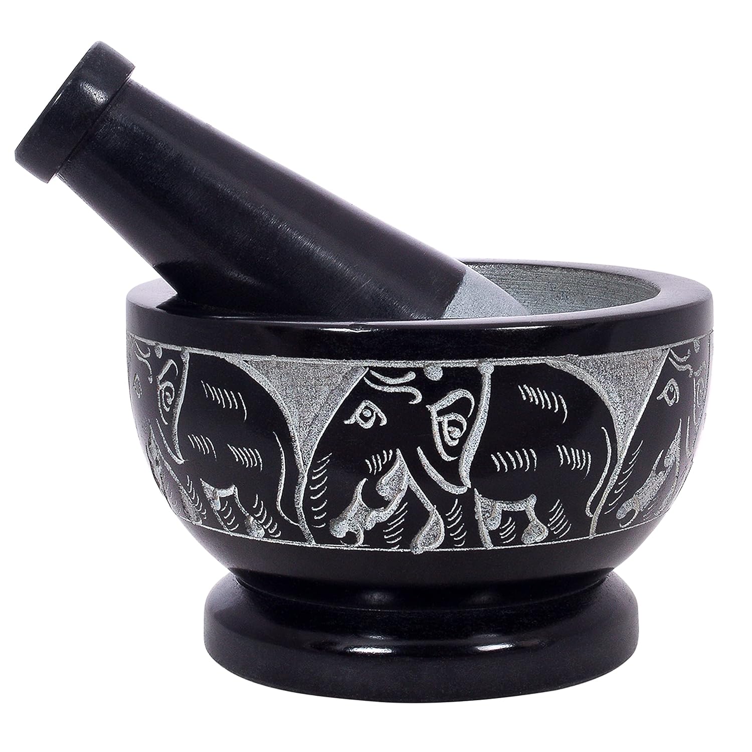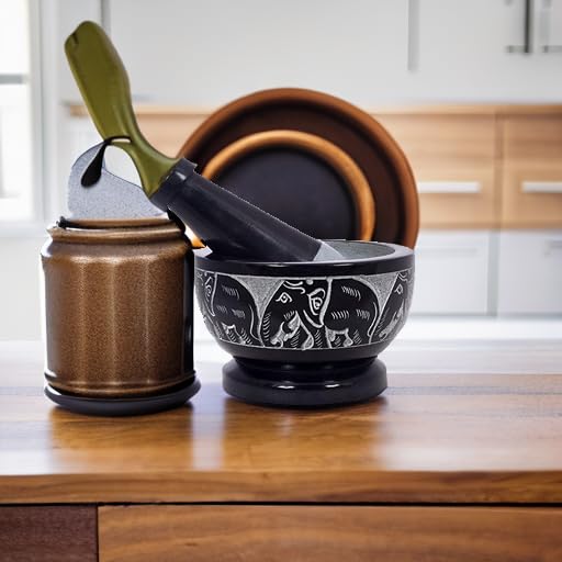 - THE PERFECT BLEND OF FORM AND FUNCTION! - The mortar and pestle have been used for centuries as the perfect way to grind and mix ingredients. The non-porous material featuring intricate engravings of elephants ensures that flavors and aromas are not absorbed, allowing for a true taste of your culinary creations.
