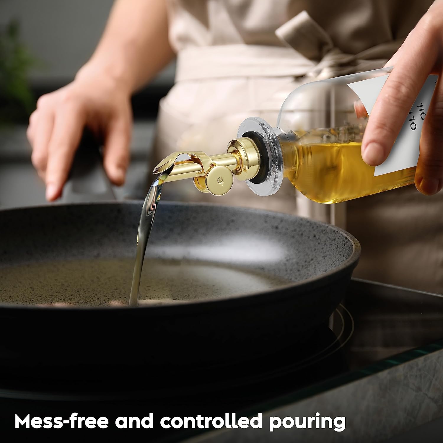 - Elegant & Aesthetically Pleasing β The minimalist and class design makes this small olive oil dispenser bottle the boost of elegance that your kitchen needs. Enjoy the modern feel of glass and gold plated stainless steel every time you cook.