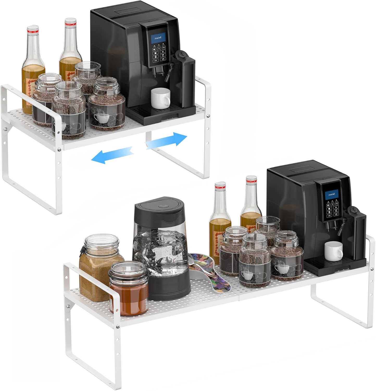 - ăExpandable and stackable designă--The Adjustable Countertop Organizer (collapsed) each measures 16.5" L x 10.2" W x 9.8" H, expands from 16.5" to 27.5" wide. You can also stack two shelves together to create a two-tier storage space.