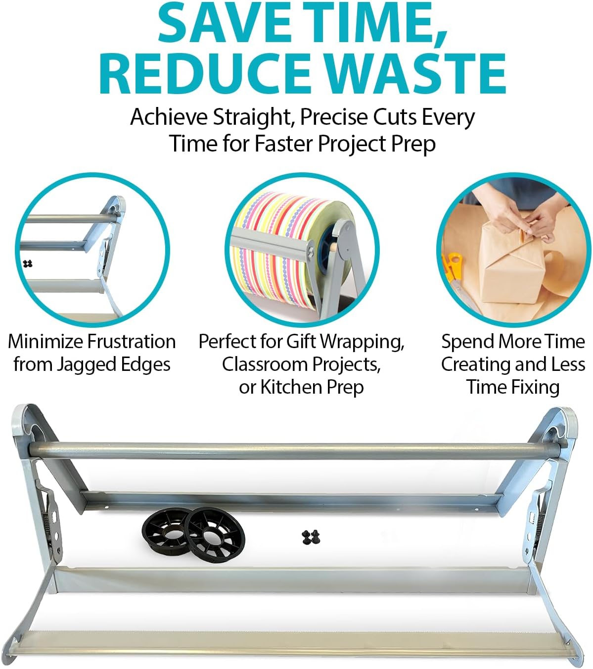 - KEEP PAPER NEAT, ACCESSIBLE & READY TO USE – No more messy rolls or wasted paper—this paper roll dispenser and cutter keeps your paper organized, easy to grab, and always ready when you need it. This kraft paper roll dispenser smart, time-saving solution for busy kitchens, classrooms, or workspaces.