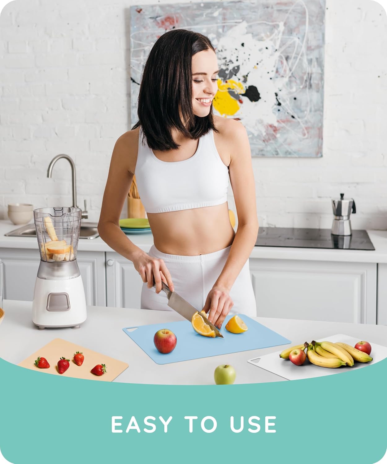 - πͺULTRA LIGHTWEIGHT DESIGN! Our rectangular flexible cutting board set is easy to use! Their thick surface serves great for quick and simple chopping needs such as slicing fruit. Simply hand wash your kitchen cutting board with mild soap, to clean. Take the stress out of meal prep with our plastic cutting boards for kitchen use, and enjoy cooking made simple!