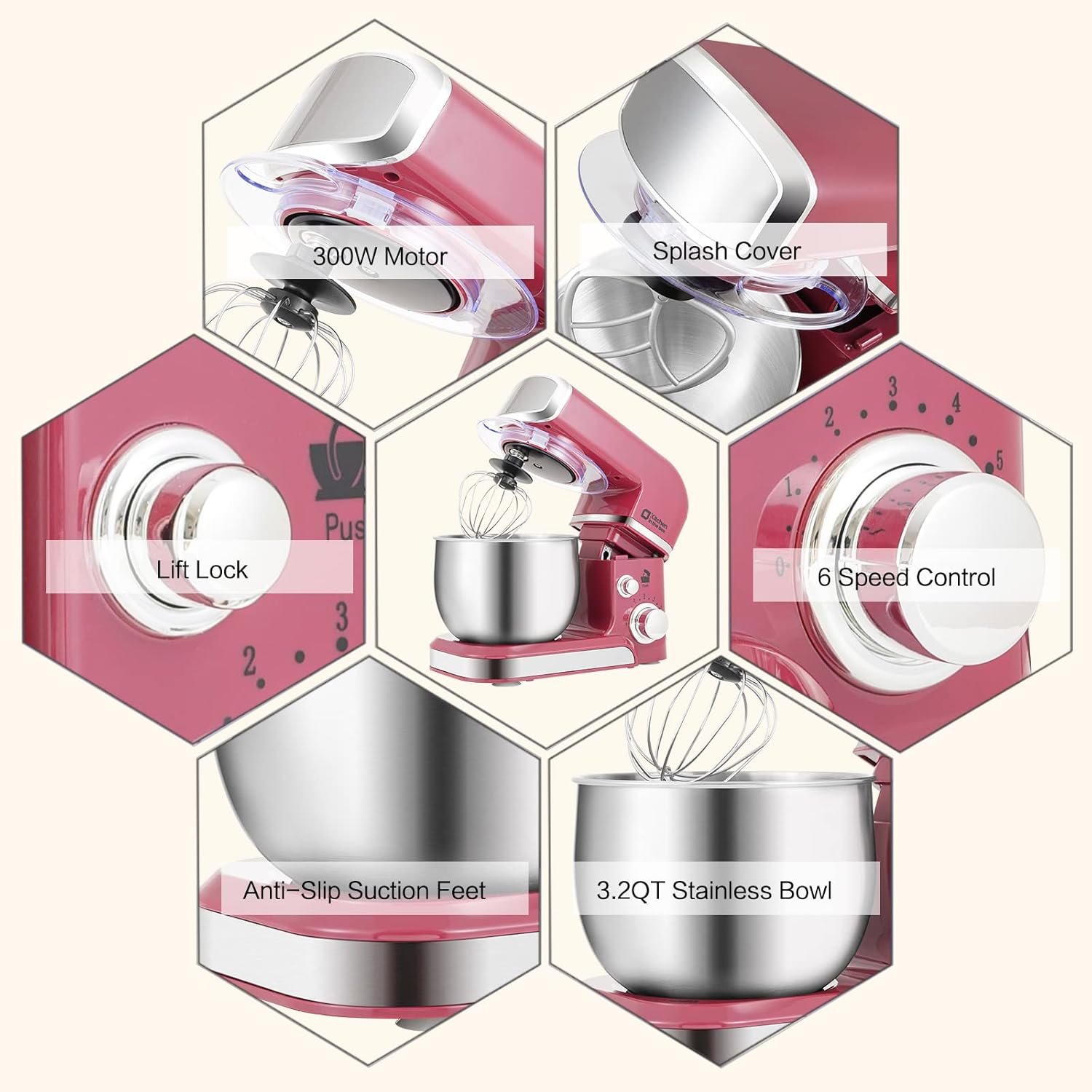 - 3.2Qt Capacity and Tilt Head Design - Our little kitchen mixer equipped with 3.2Qt stainless steel bowl,suitable for new baker,1-2 members family or couples,easy to operate and clean up.Tilt-head design mixer allows access to install or uninstall bowl and accessories easily.And transparent anti-splash lid could prevent the ingredient making a mess.