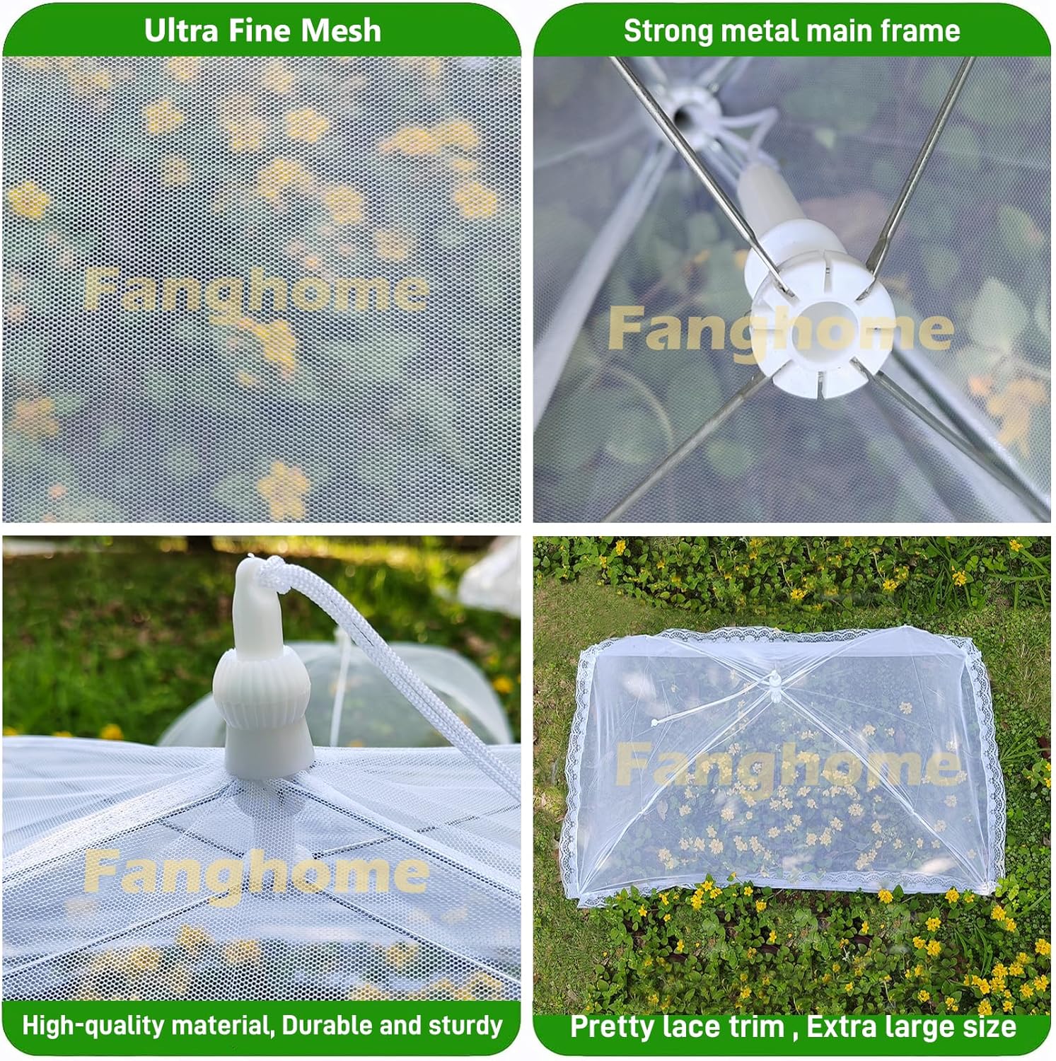- High Quality: The extra large outdoor mesh food cover is made from high-quality nylon mesh, providing excellent ventilation and visibility. food nets for outdoors also features galvanized steel wire for sturdy support and an umbrella-shaped structure for easy opening and folding. Crafted from high-quality materials and designs, our outside food covers are built to last.