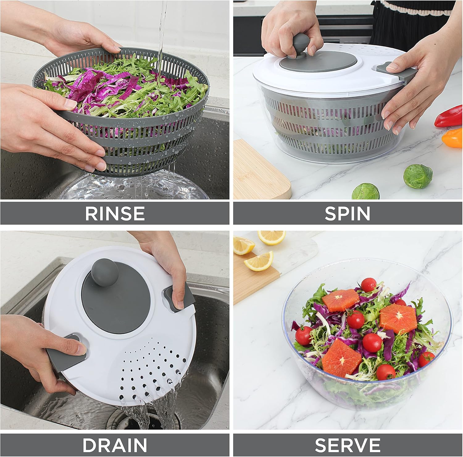 - Promotes Healthy Eating - Our Salad Spinner makes it so easy to prepare nutritious foods every night of the week; large salad spinner helps you to clean and serve salad greens and other produce, including fruits and even berries in seconds