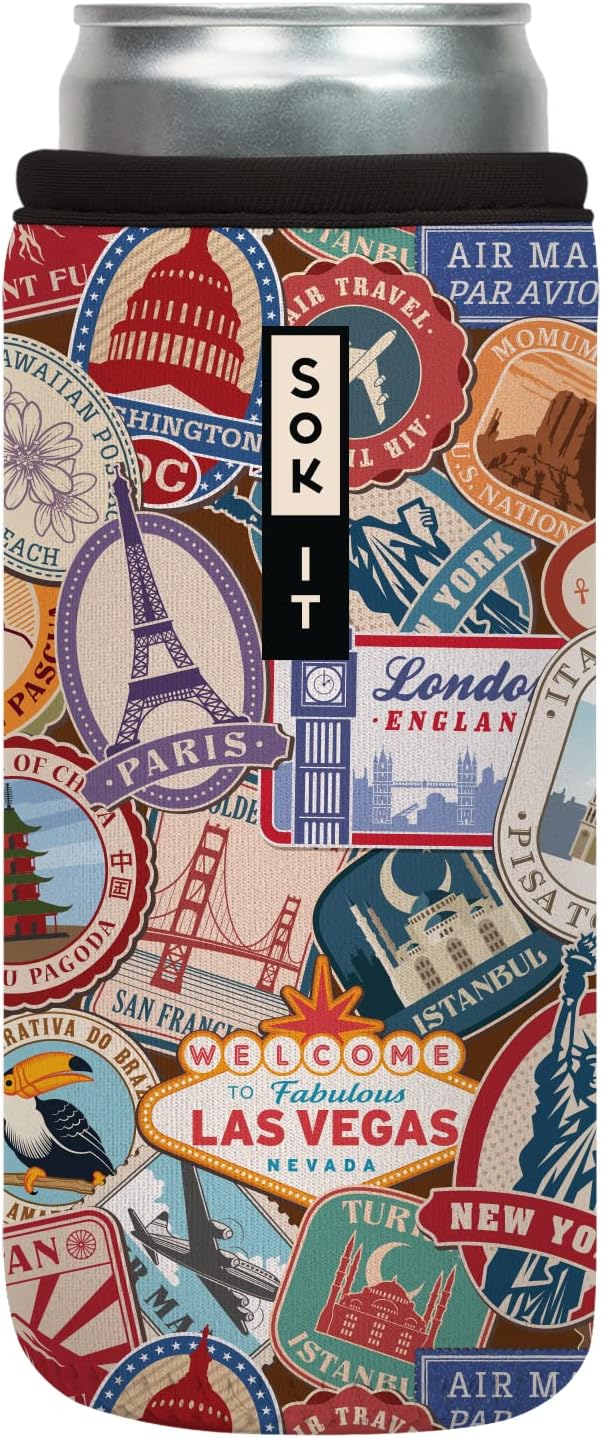 Sok It CanSok Sleeve for Beer & Soda Insulated Neoprene Cover (World Traveler, 12oz Slim Can Sleeve)
